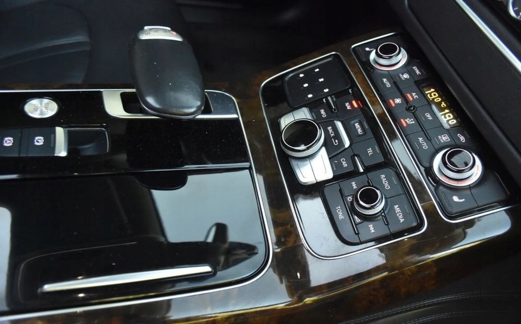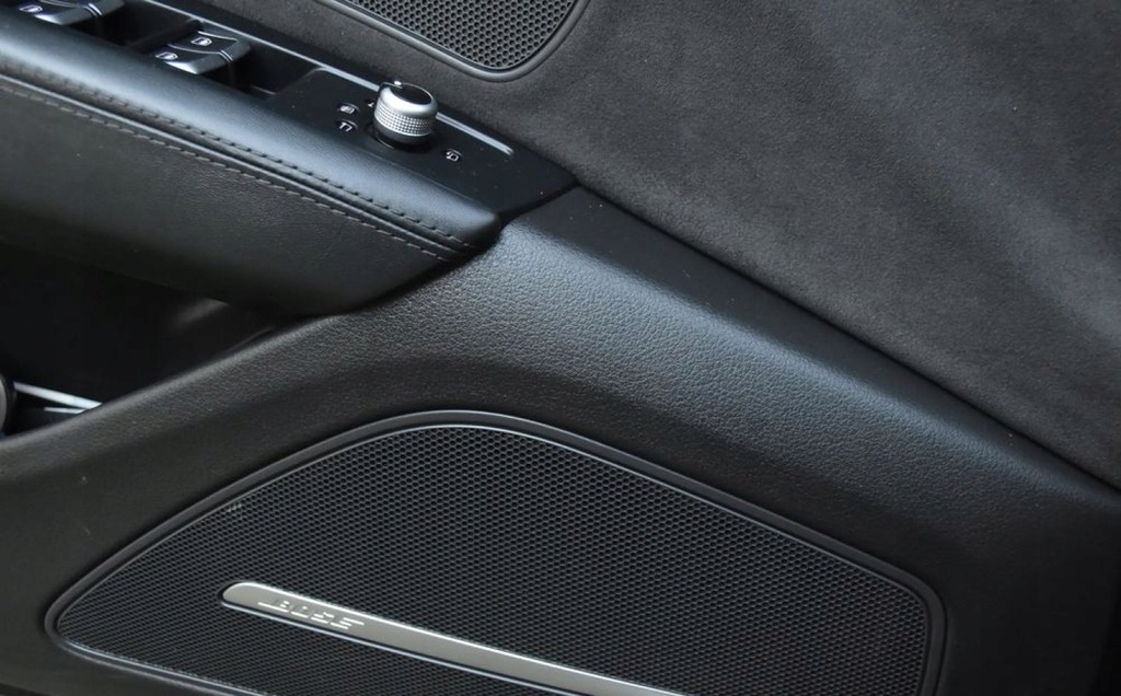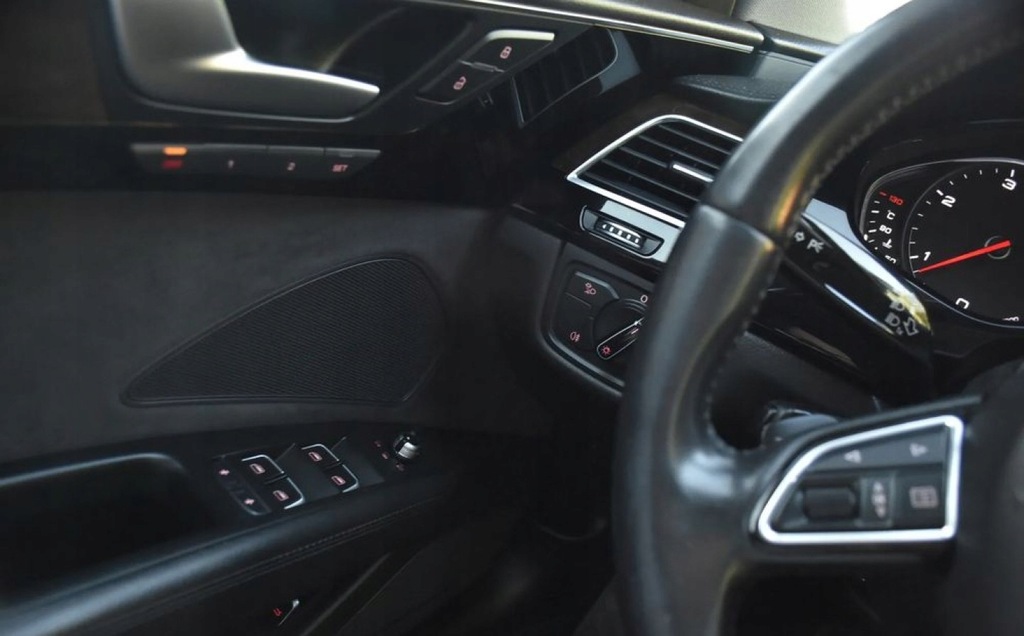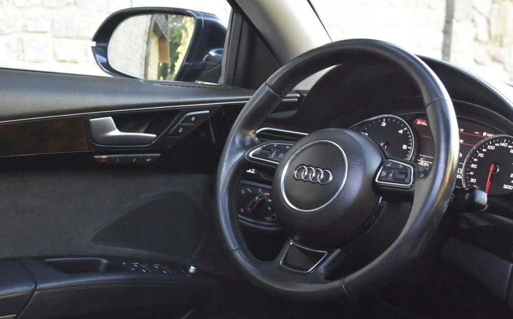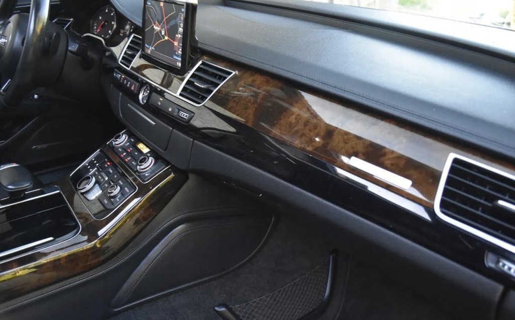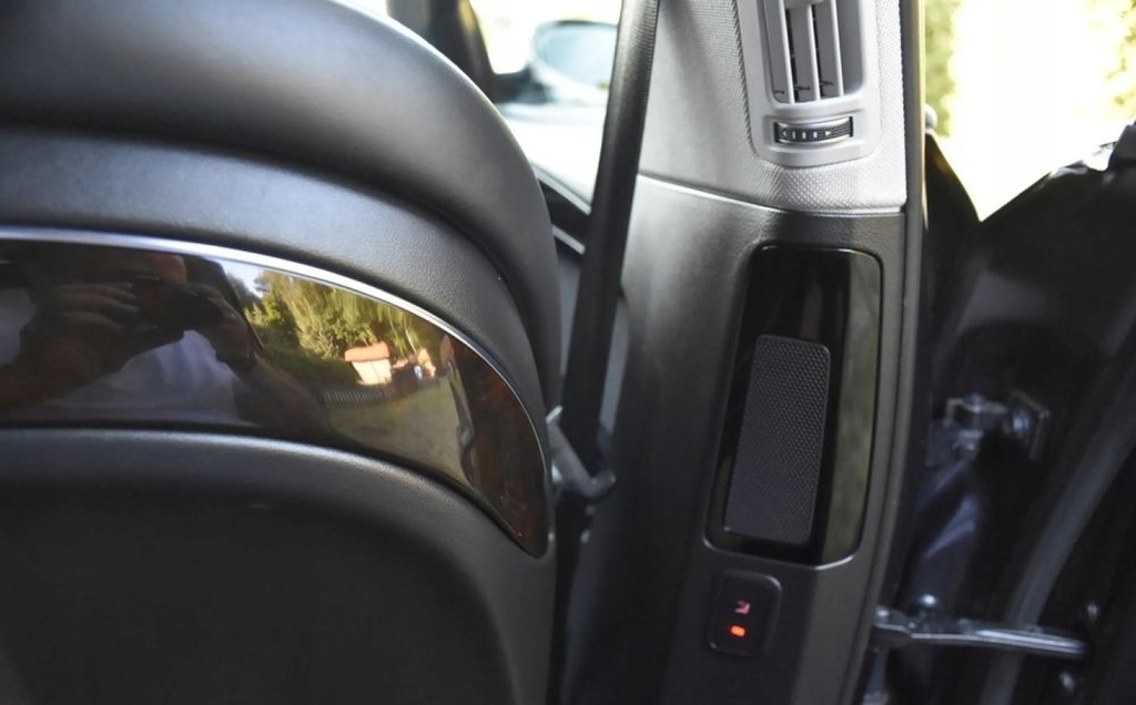 Deska rozdzielcza i krawędzie drzwi wykończone skórą i oryginalnym drewnem