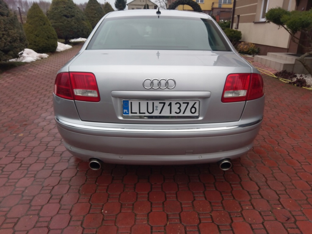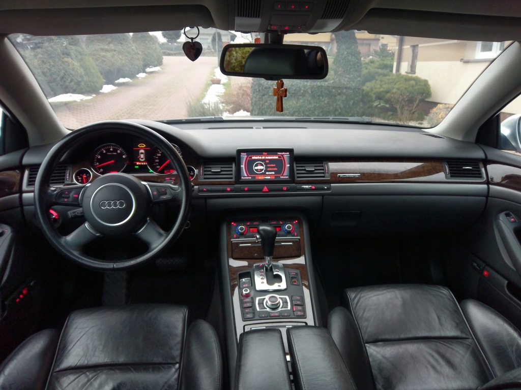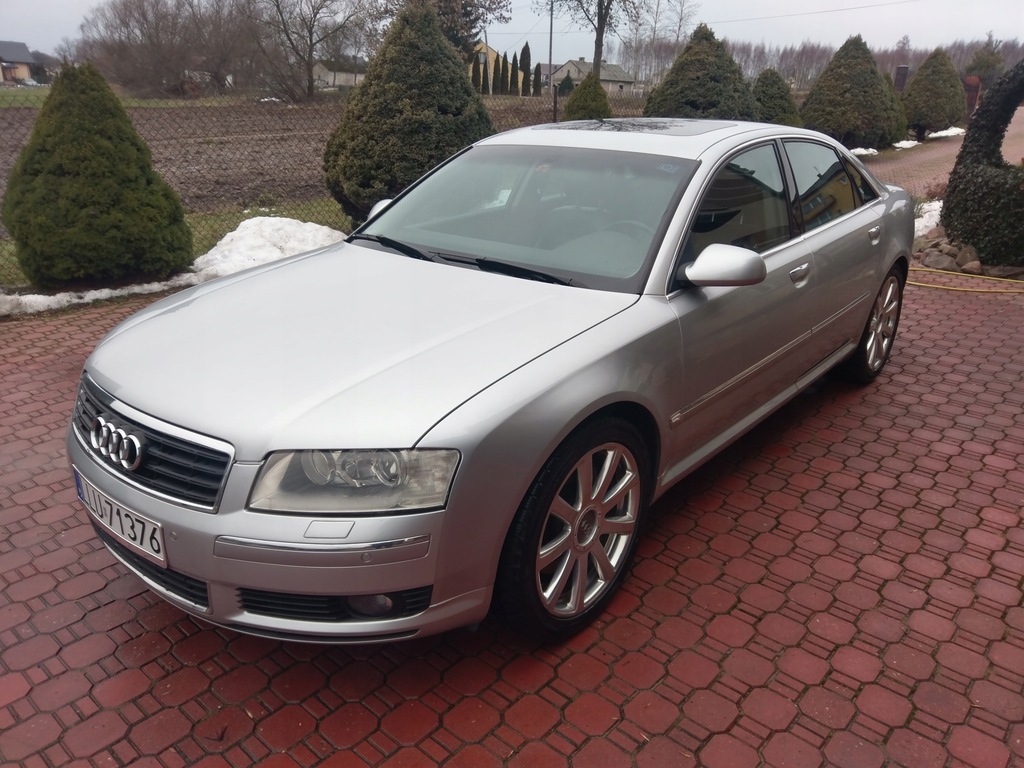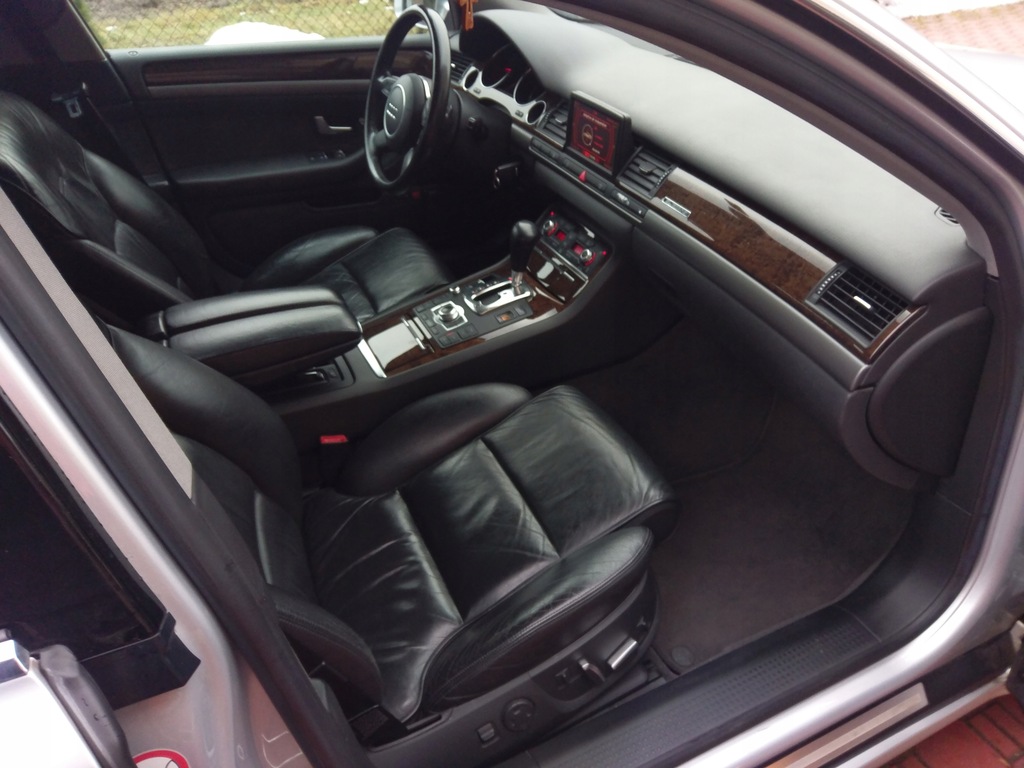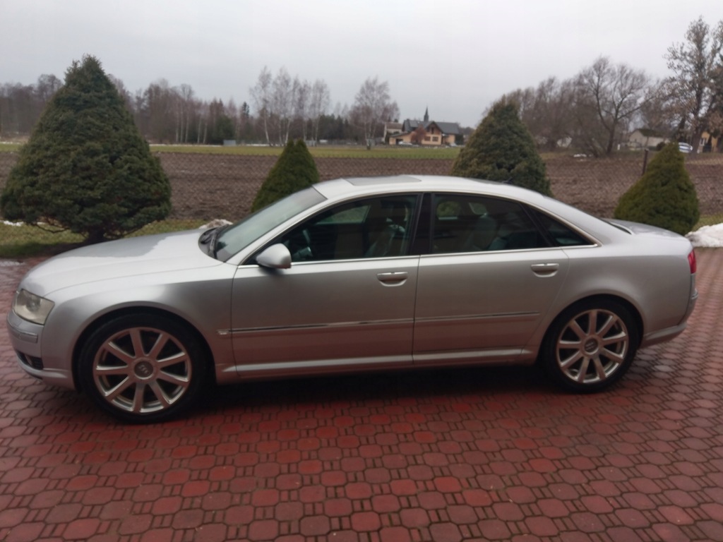 Sprzedam Audi A8 D3 4.2 V8 QUATTRO benzyna o mocy 335 KM. Rok produkcji 3.09.2003r. Jestem pierwszym właścicielem w kraju, drugim właścicielem w historii pojazdu. Auto w świetnym stanie nie wymaga żadnego wkładu finansowego. Aktualny stan licznika to 302604 km. Ostatni wpis w książce serwisowej przy stanie licznika 291945km. Ostatnia wymian oleju, filtru oleju i powietrza wykonana Październik 2018r. Przegląd i OC ważne do 23.08.2019r. Co do wyposażenia auta nie będę się wiele rozpisywał, każdy zainteresowany z pewnością wie co siedzi w A8. Wspomnę tylko najważniejsze rzeczy takie jak Pneumatyczne zawieszenie, system nagłośnienia BOSE, odpalanie z czytnika linii papilarnych, czterostrefowa klimatyzacja. W aucie zamontowałem pięknie brzmiące sportowe wydechy dedykowane do A8 4.2 firmy ULTER. Auto jeździ na pięknych 20 calowych felgach aluminiowych. Aktualnie założone NOWE zakupione na tą zimę opony, w komplecie również opony letnie. Cena do negocjacji.