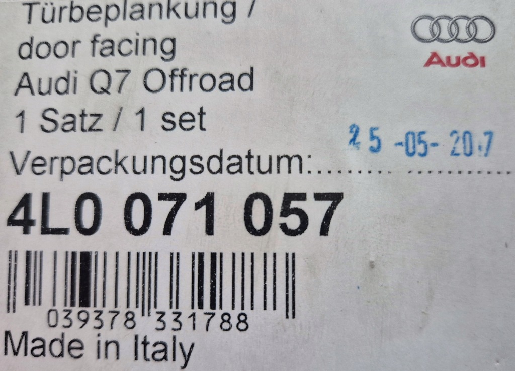 Listwy drzwiowe w metalicznym wykończeniu w kolorze kamiennej szarości, zamontowane pod drzwiami, nadają pojazdowi jeszcze bardziej efektowny wygląd i zapewniają redukcję odprysków kamieni i innych uszkodzeń spowodowanych uderzeniami. Jest to zestaw, w zestawie znajduje się zarówno lewa, jak i prawa strona (6 elementów). Nie w połączeniu z linią S-Line lub wzmocnionym zderzakiem. Te plastikowe osłony chronią dolną część drzwi. Ich 5-calowa szerokość zmniejsza uszkodzenia spowodowane odpryskami kamieni i innymi zanieczyszczeniami drogowymi, a także dodaje charakterystycznego wyglądu. To pakiet terenowy. Rok modelowy: 2007 i nowsze