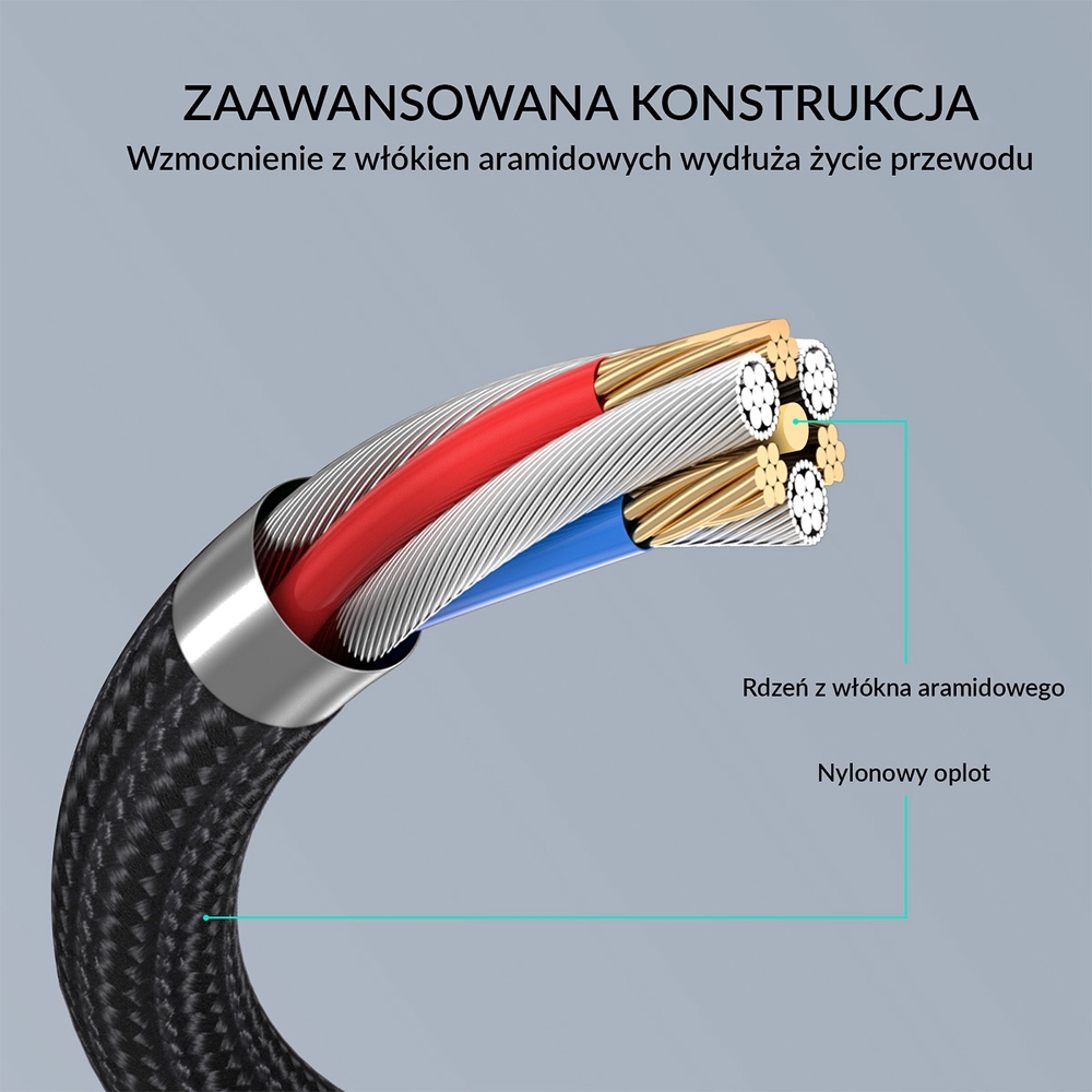 Kabel został wyposażony w aramidowe włókno, które chroni przed uszkodzeniami mechanicznymi, takimi jak ścieranie, uderzenia czy zginanie. Dzięki temu jest bardziej odporny na uszkodzenia, co zapewnia długotrwałe użytkowanie nawet w intensywnie wykorzystywanych środowiskach. Wykorzystanie aramidowego włókna, odpornego na zużycie, oznacza, że kabel ma dłuższą żywotność niż tradycyjne kable. Jest to inwestycja na dłużej, która pozwala cieszyć się niezawodną funkcjonalnością przez wiele lat.