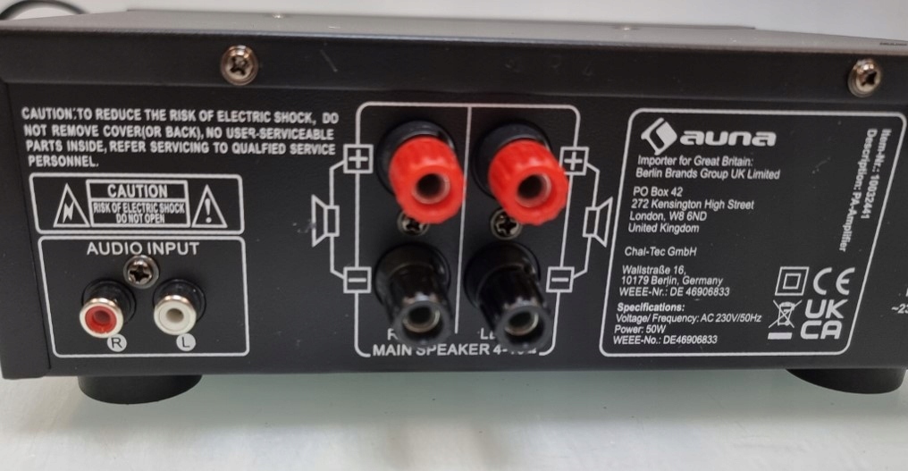 złącza: 1 x port USB, 1 x port SD, 2 x 3,5 mm jack wejście mikrofonowe, 1 x wejście liniowe RCA, 2 x wejście / zaciski głośnikowe