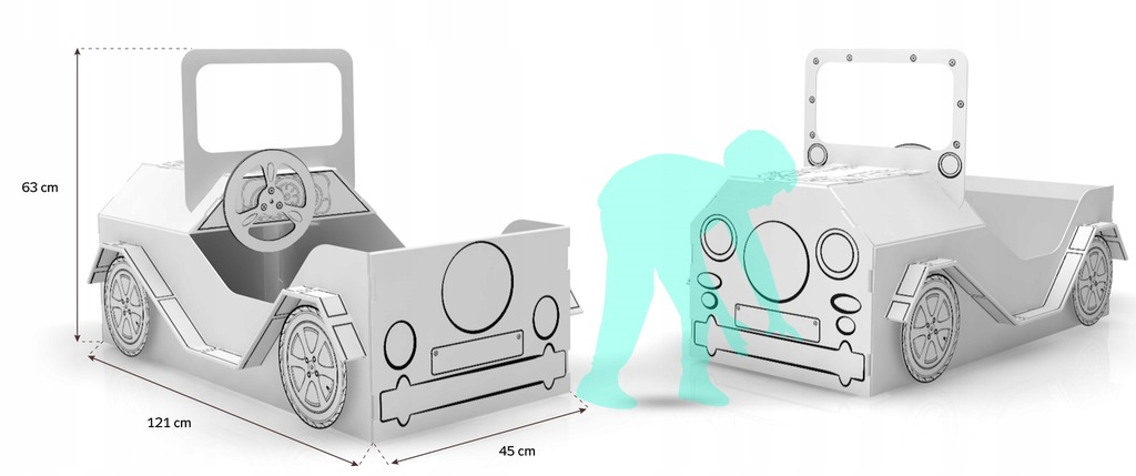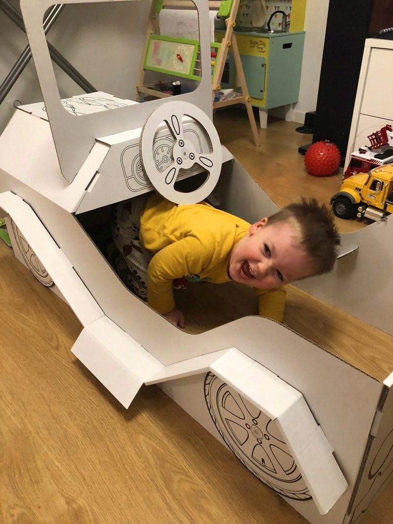 Auto z kartonu - wykonane z najwyższą starannością z łatwej do malowania tektury. Zadruk na samochodzie jest taki, jak na wizualizacji czarno- białej