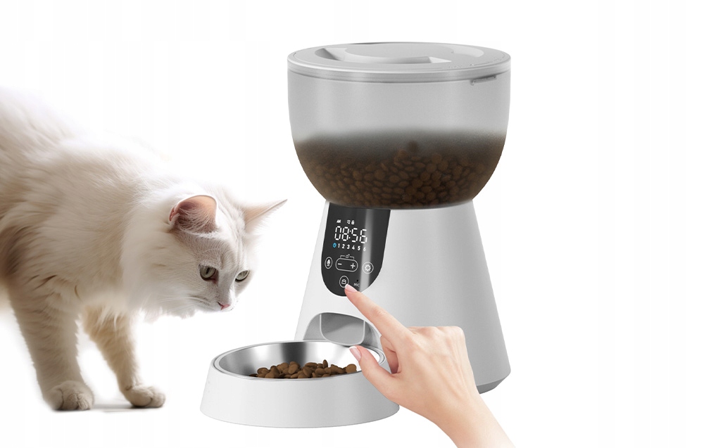 Dozownik został wyposażony w duży zbiornik na karmę o pojemności 4 l. To wystarczy na naprawdę długo! Co więcej, jest on przezroczysty, co pozwala na wygodne monitorowanie poziomu jedzenia bez konieczności jego otwierania. Dzięki temu zawsze będziesz wiedzieć, gdy nadejdzie czas na uzupełnienie zapasów!