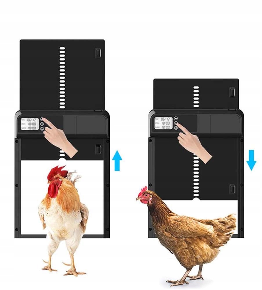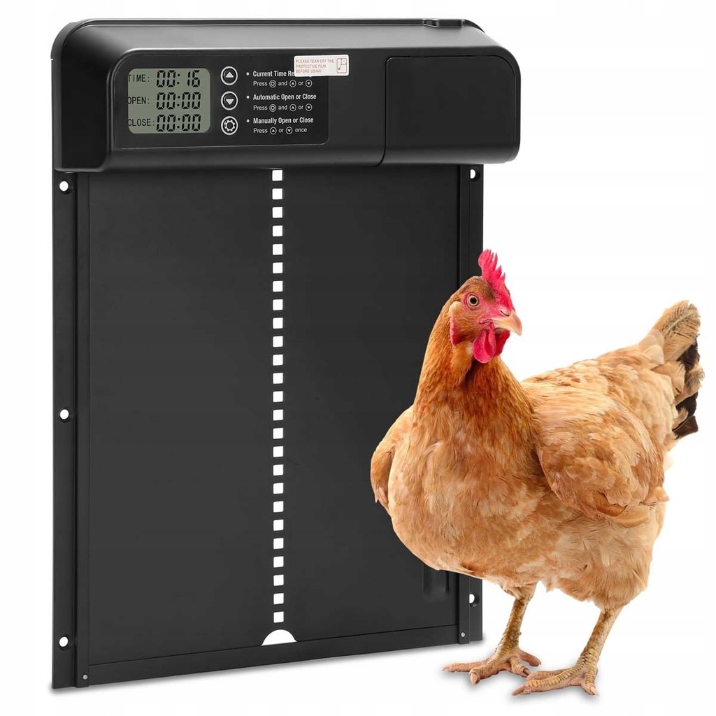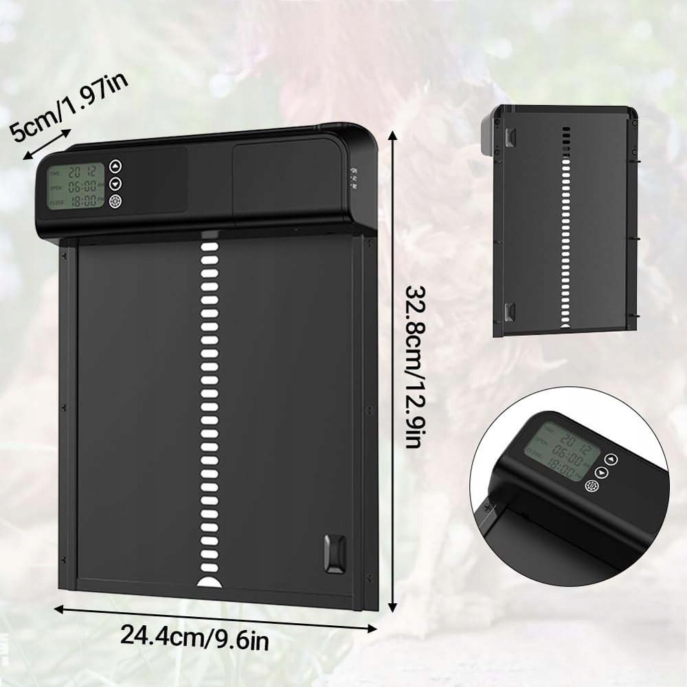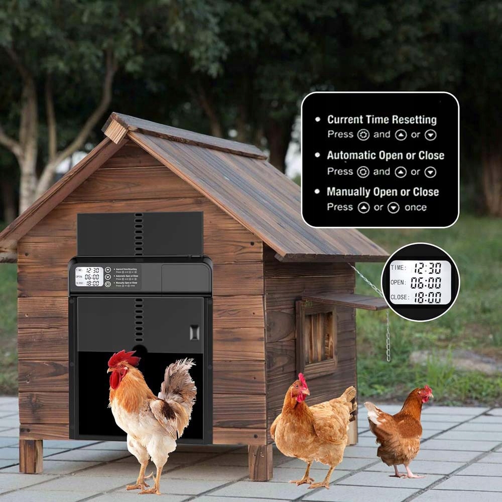 - 🐓 Wyposażony w 24-godzinny timer, czas otwierania i zamykania można dowolnie regulować każdego dnia, z dokładnością do minuty.
