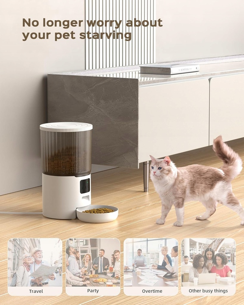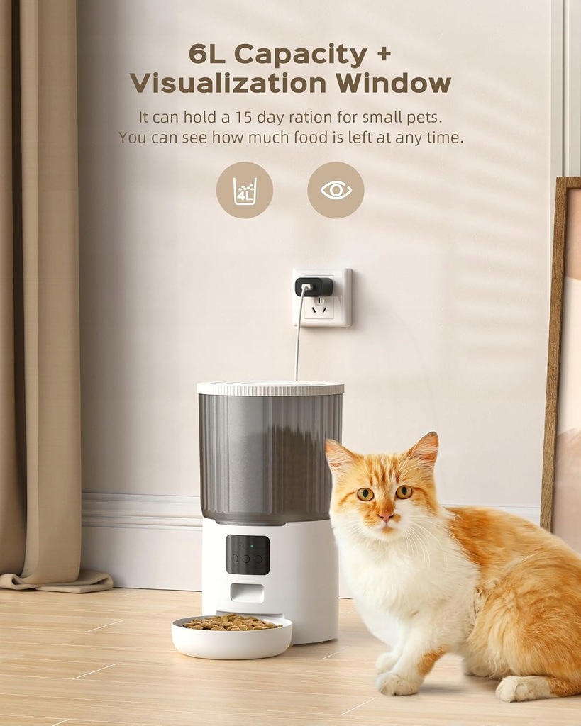 【Wystarczająca pojemność】Nasz automatyczny karmnik dla kotów mieści do 6 litrów suchej karmy dla zwierząt. Nakarm swoje zwierzęta i zapewnij im rozrywkę, gdy jesteś poza domem, wszystko na wyciągnięcie ręki! Gdy wybierasz się w krótką podróż służbową, nie musisz się już martwić, że Twój pupil będzie głodny.