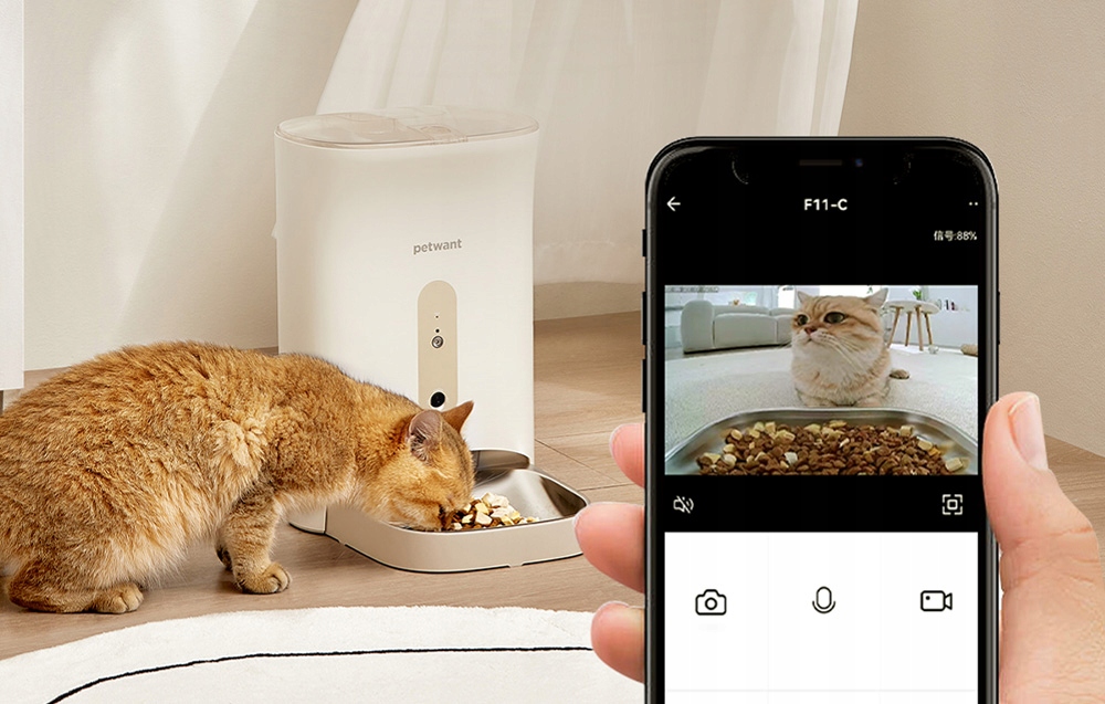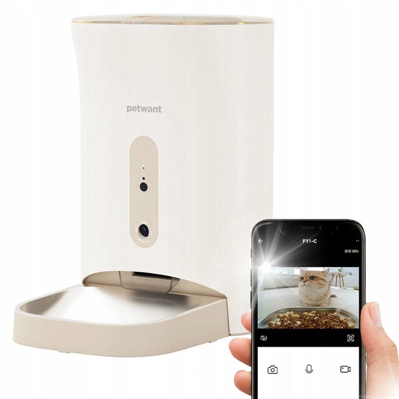 Chcesz wiedzieć co dzieje się z Twoim futrzastym przyjacielem pod Twoją nieobecność? Teraz to możliwe! Automatyczny dozownik PetWant posiada wbudowaną kamerę i umożliwia prowadzenie rozmów – możesz mówić do zwierzaka i wydawać mu polecenia na odległość.