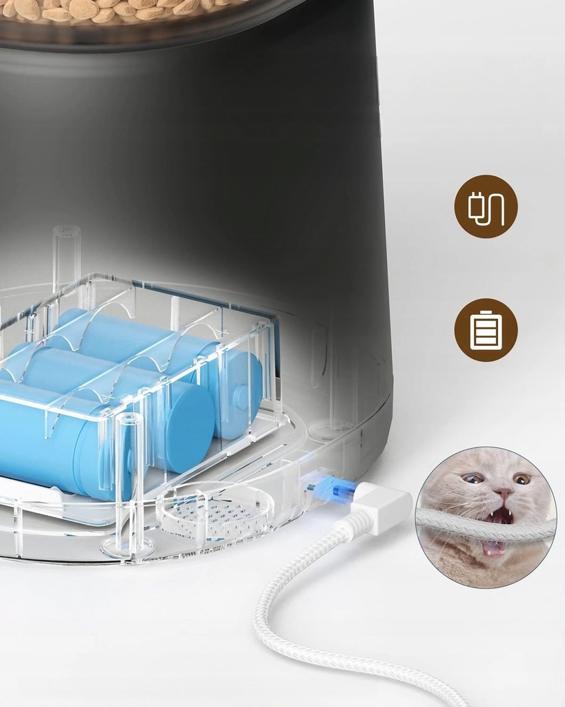 Rojeco oferuje system podwójnego zasilania, który łączy zasilanie sieciowe z bateriami. W razie przerwy w dostawie prądu urządzenie automatycznie przełącza się na tryb zasilania bateryjnego, co zapewnia ciągłość karmienia. To idealne rozwiązanie dla osób, które chcą mieć pewność, że ich zwierzak nie pozostanie głodny, nawet w przypadku awarii.
