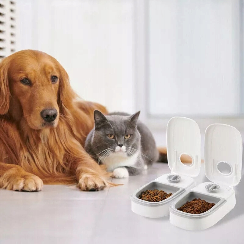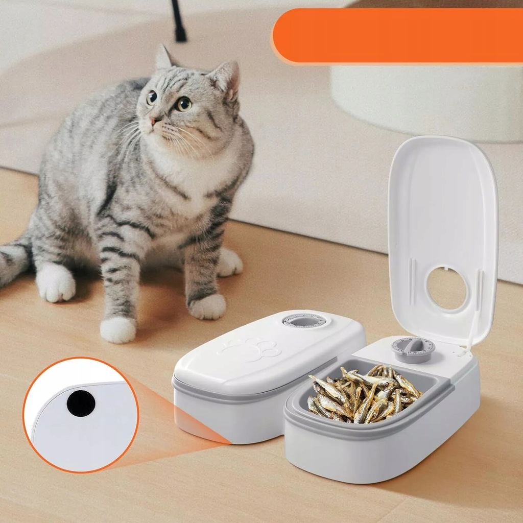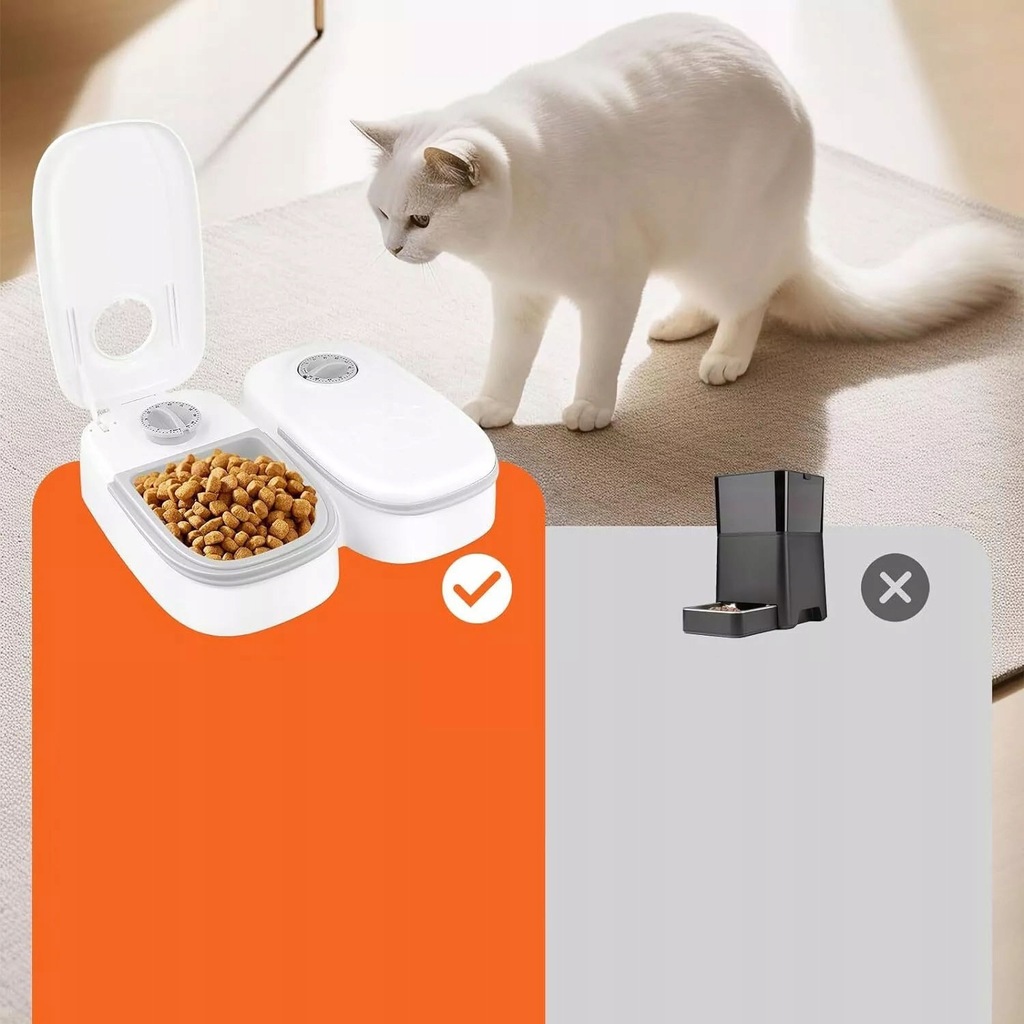 Automatyczny podajnik dla kotów mieści do 12,4 uncji (350 ml) suchej lub półmokrej karmy na miskę, a podajnik dla kotów z mokrą karmą jest odpowiedni dla kotów i małych i średnich psów, aby pomóc Ci w regularnym harmonogramie karmienia.