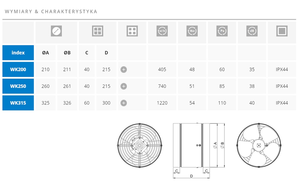 Wentylatory serii WK wykonane są w całości z blachy ocynkowanej, co przekłada się na ich trwałość. Mogą być wykorzystywane jako wentylatory wywiewne lub nawiewne w pionowym bądź poziomym położeniu. Dzięki zastosowaniu silników 3-biegowych, istnieje możliwość dopasowania parametrów wentylatora do potrzeb użytkownika, zależnie od sposobu podłączenia.