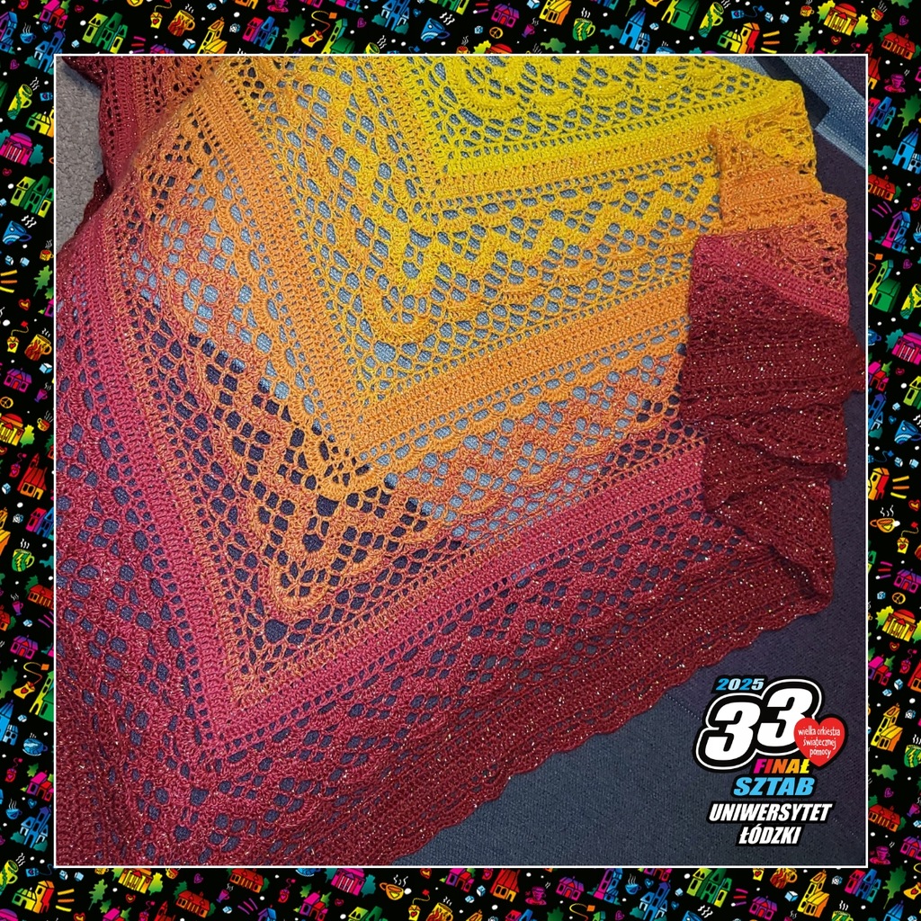 Chusta wydziergana szydełkiem z włóczki ombre o składzie: 49% bawełna, 48% akryl, 3% lureks.