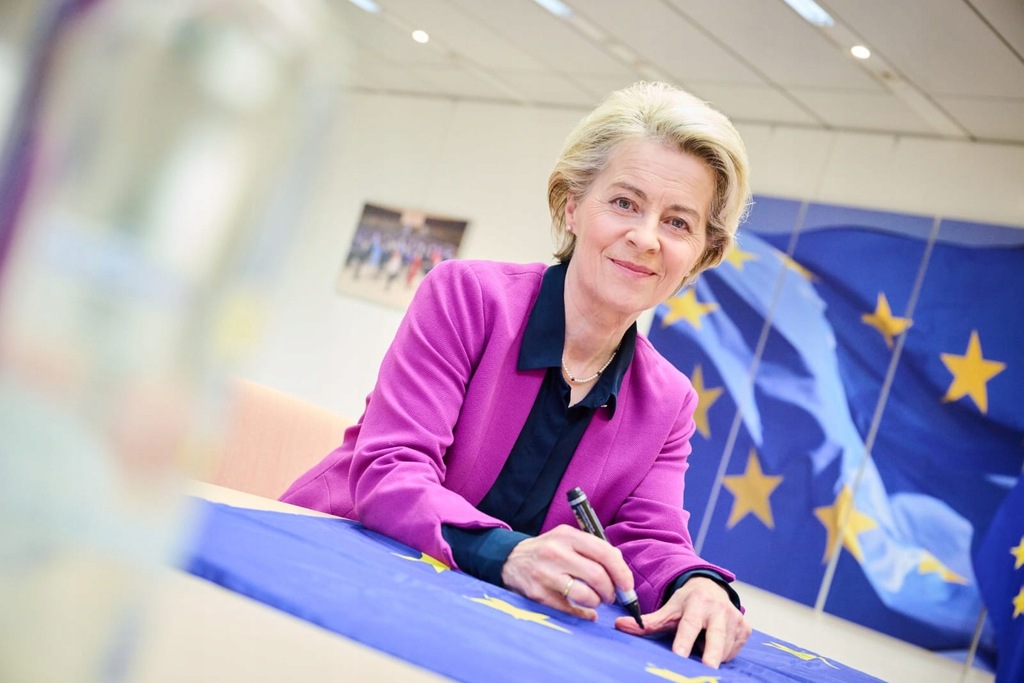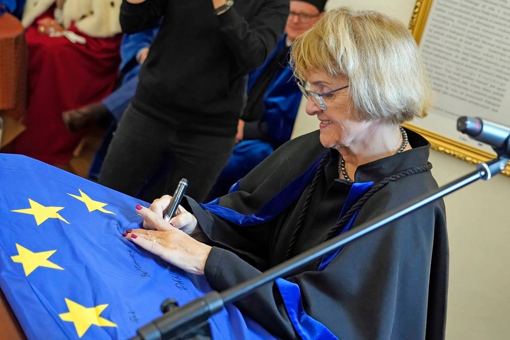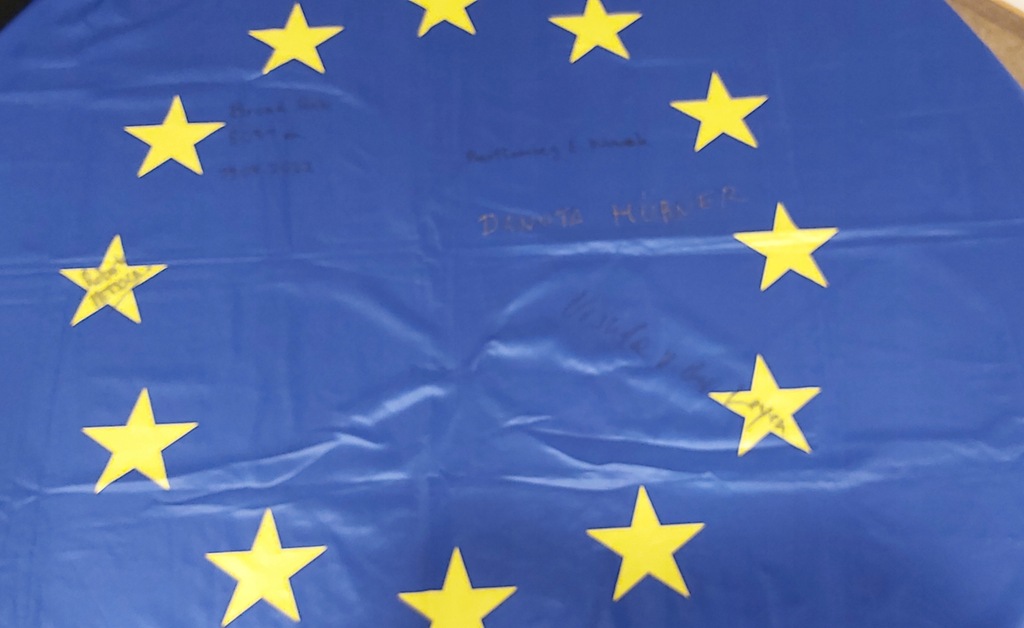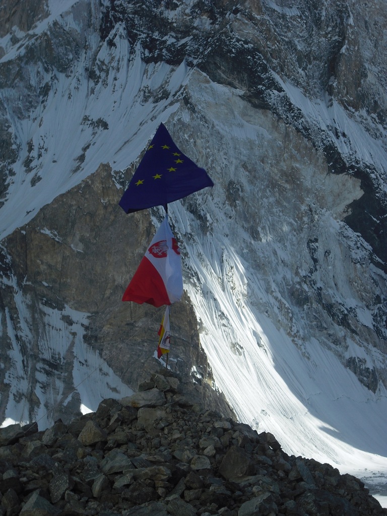 Flaga Unii Europejskiej ze szczytu Broad Peak wraz z podpisami