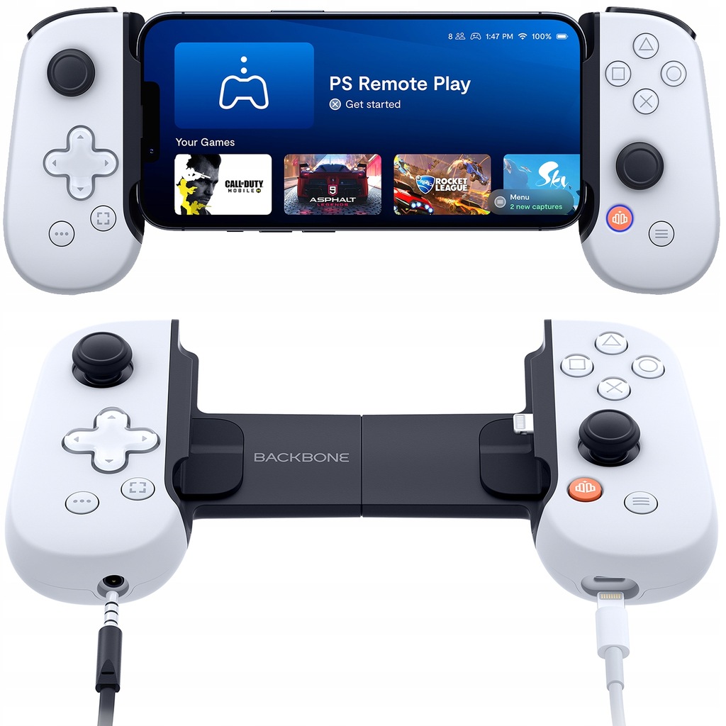 Backbone One - kontroler do telefonu (PlayStation)Przekształć swój telefon w najlepszą konsolę do gierZAMIEŃ iPHONE W KONSOLĘ GAMINGOWĄChwyć Backbone One, połóż palce wskazujące na klikalnych spustach, kciuki umieść na elementach sterujących i pozwól sobie na totalny, gamingowy odlot. Fortnite, Call of Duty, Diablo Immortal … Backbone zapewnia potężne wzmocnienie wrażeń, stwarzając ryzyko całkowitego pochłonięcia użytkownika przez grę.