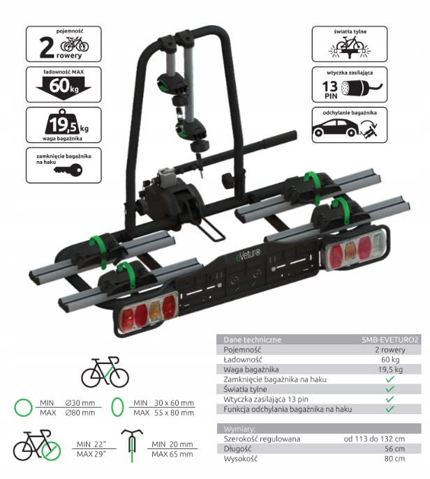 e-Veturo 2 to uniwersalny bagażnik na rowery pasujący do każdego auta wyposażonego w hak. Produkt przystosowany jest do przewożenia dwóch osobno zapinanych rowerów elektrycznych. Maksymalna masa obciążenia bagażnika to około 60 kg. Bardzo wygodną opcją jest możliwość uchylania platformy aby dostać się w szybki sposób do bagażnika bez konieczności ściągania całego bagażnika. Platforma wyposażona jest w pełne zabezpieczenie przez kradzieżą (zabezpieczenie na kuli haka oraz każdego roweru z osobna)