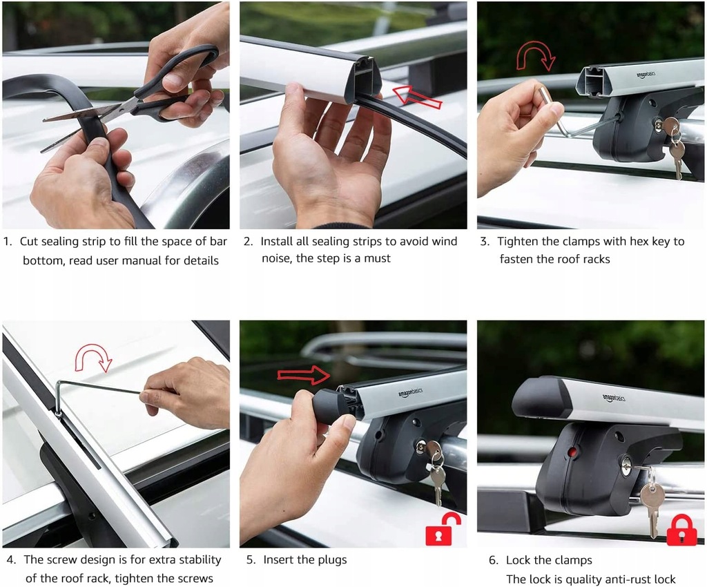Gumowe taśmy uszczelniające, znajdujące się w opakowaniu do montażu na szynach, redukują hałas wiatru (postępuj zgodnie z instrukcją na papierze lub filmem na stronie produktu).