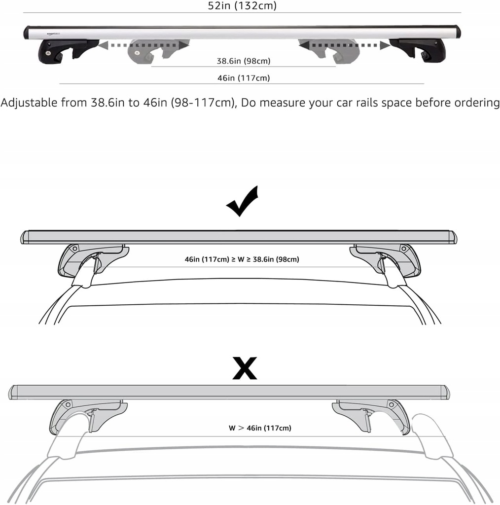 Uniwersalny bagażnik dachowy z relingami poprzecznymi o długości 132,08 cm jest kompatybilny z większością samochodów, SUV-ów lub samochodów terenowych z podwyższonymi relingami wzdłużnymi. Odległość między dachem samochodu a szyną musi wynosić 1,3 cm lub więcej, między dwoma szynami musi być większa niż 98 cm i mniejsza niż 117 cm, a średnica szyny musi wynosić od 36 do 55 mm.
