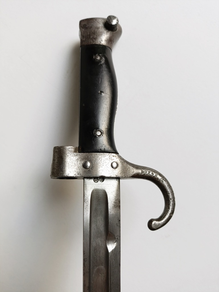 Jest to druga wersja z okładzinami rękojeści z bakelitu oraz przedłużonym pierścieniem jelca. Bagnet posiada numer fabryczny oraz stemple odbioru. Stan bardzo dobry