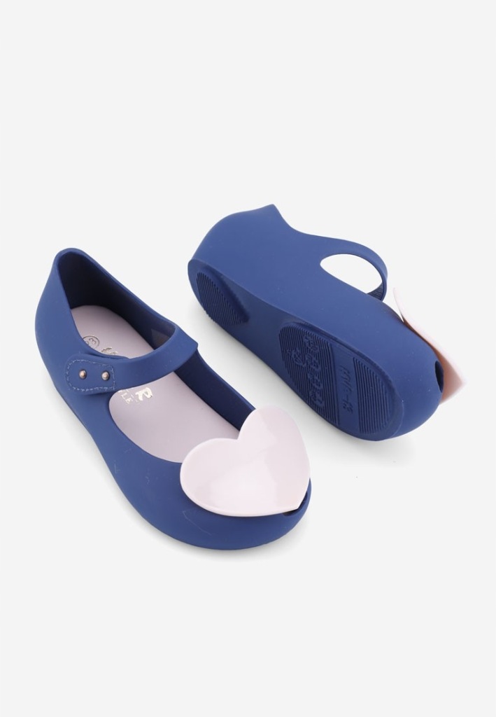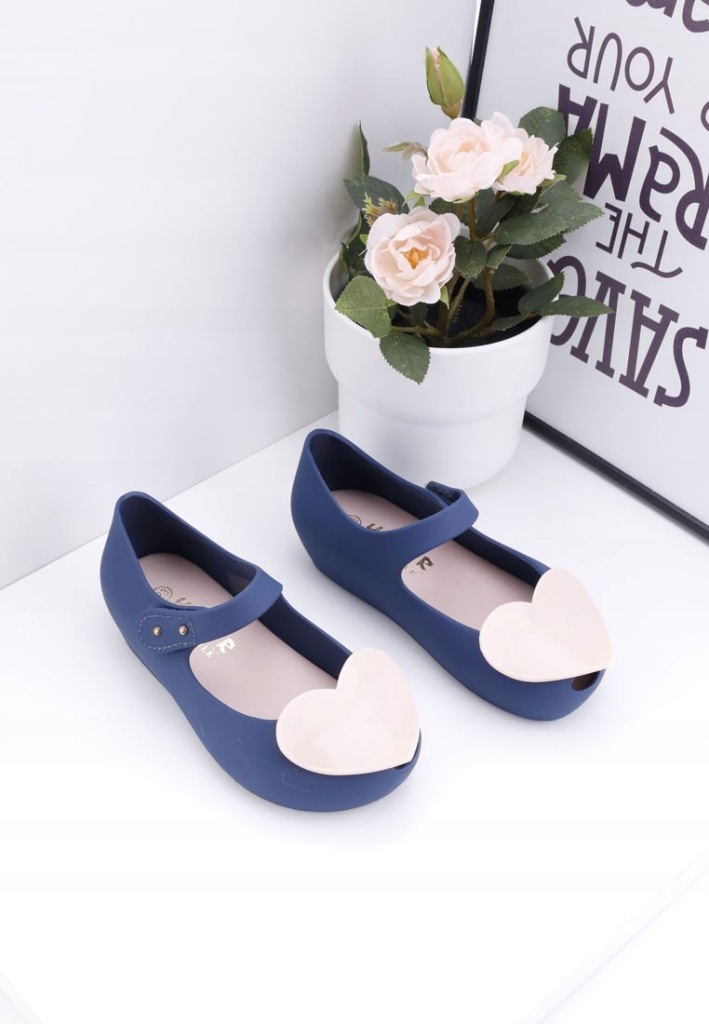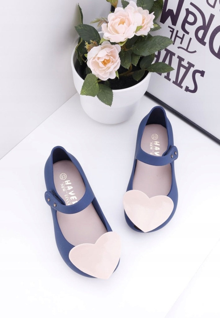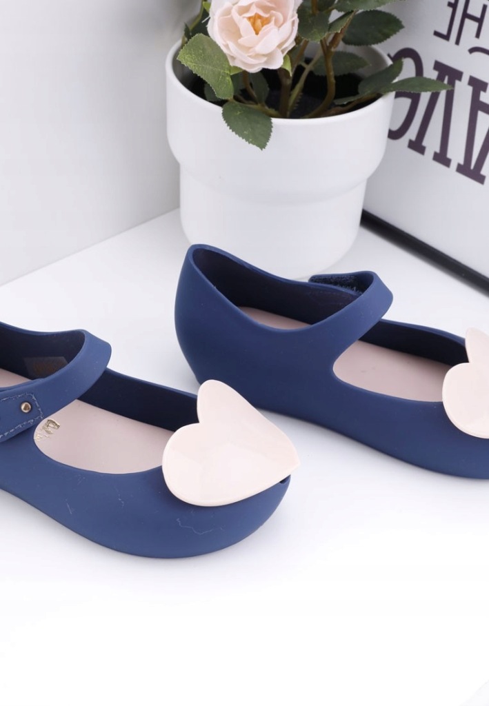 Balerinki-meliski ,na lekkim podwyższeniu. Cholewka niska ,cała wykonana z gumy. Na nosku aplikacja ozdobna -serce . Model wodoodporny ,zapisany na rzep. Śliczne buciki dla Twojej pociechy.