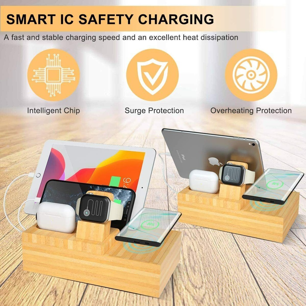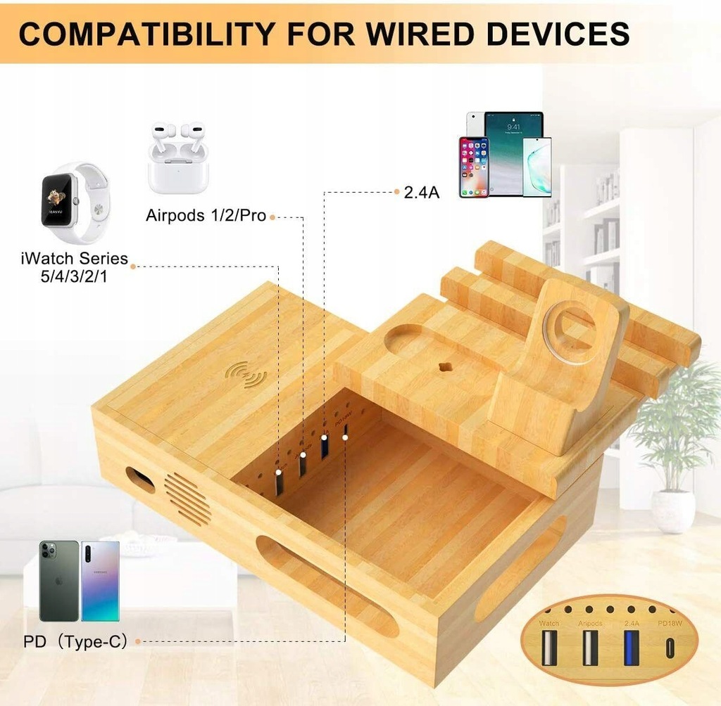 5 w 1 Stacja Ładowania z Bambusa dla Wielu Urządzeń 3 TRYBY DLA ŁADOWANIA BEZPRZEWODOWEGO 7.5W: Kompatybilne z iPhone 11/11 Pro/11 Pro Max/Xs/Xs Max/XR/X/8/8 Plus, 10W: Kompatybilne z Samsung S10/S10 Plus/S9/Note9/8/S7 itp., 5W: Kompatybilne z AirPods Pro/AirPods z etui do ładowania bezprzewodowego (2. generacja) oraz innymi telefonami obsługującymi standard Qi.