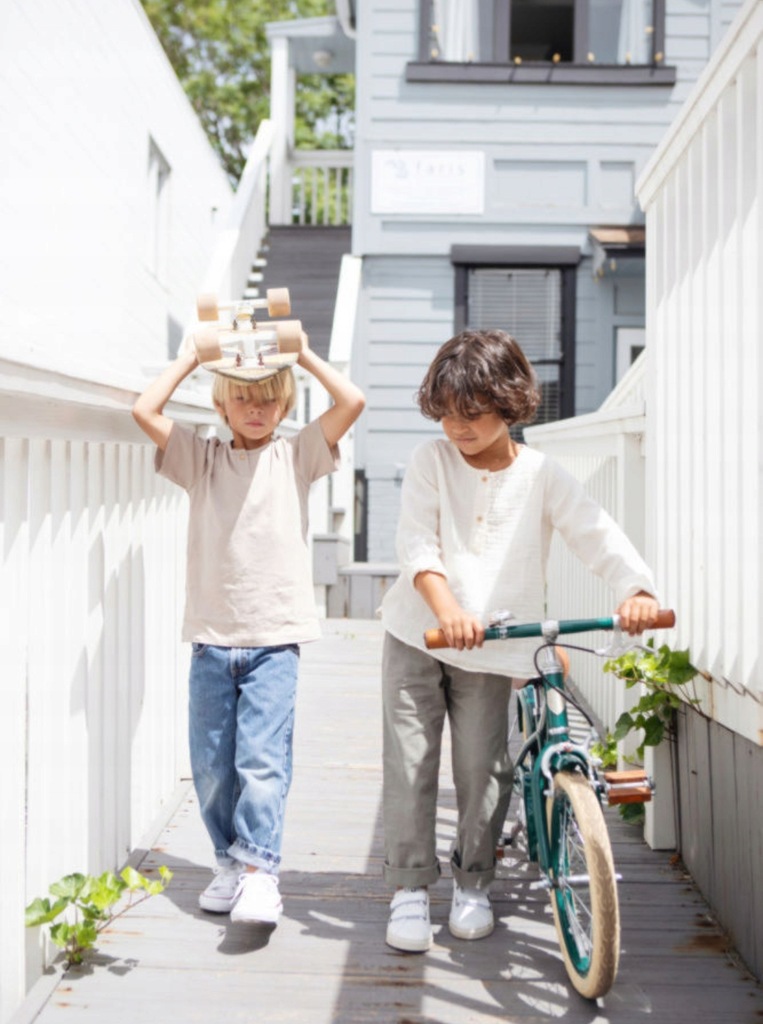 Zainspirowane stylem retro i skandynawskim wzornictwem. Lekka aluminiowa rama, brązowe skórzane siodełko i dopasowane uchwyty, sprawią, że jego właściciel będzie najbardziej "cool" mini rowerzystą w okolicy! Rowerek wyposażony jest w unikatowe palisandrowe pedały, stylowe kremowe opony oraz wiklinowy, odpinany kosz, idealny do spakowania prowiantu na dzień pełen przygód.