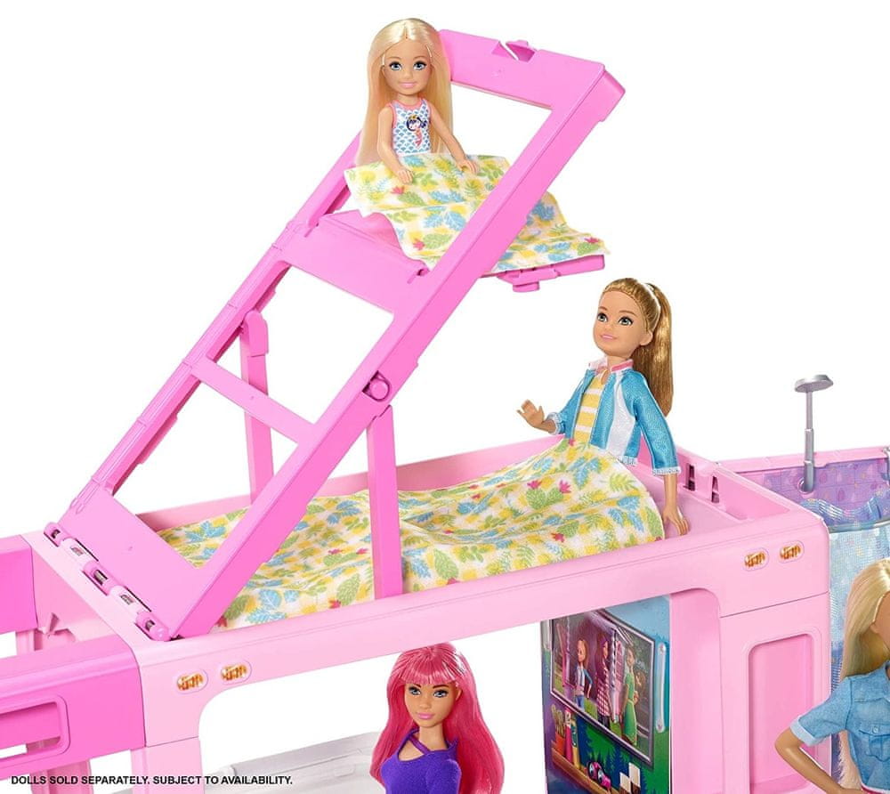 Dzięki tak wielu obszarom zabawy możesz opowiadać mnóstwo różnorodnych historyjek! Po długim dniu pełnym przygód przygotuj Barbie® i jej przyjaciołom lub siostrom miejsce do spania na dachu, gdzie mogą wpatrywać się w gwiazdy – nie zapomnij rozłożyć łóżka na górze dla Chelsea™ (lub innej małej lalki).