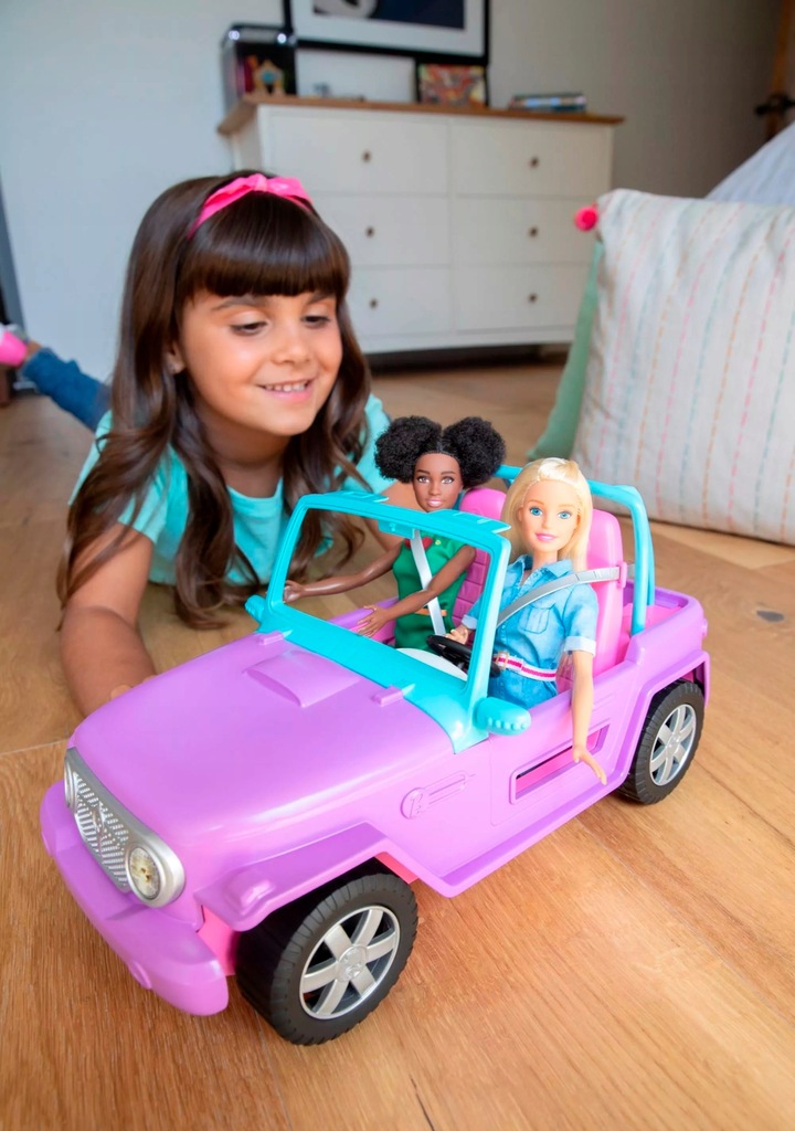 Otwarta przestrzeń w Plażowym Jeepie Barbie nadaje zabawie realizmu i pobudza wyobraźnię, by wysłać lalkę Barbie i jej koleżankę (lalki sprzedawane osobno) na przejażdżkę, rajd terenowy lub w dowolne wymarzone miejsce!
