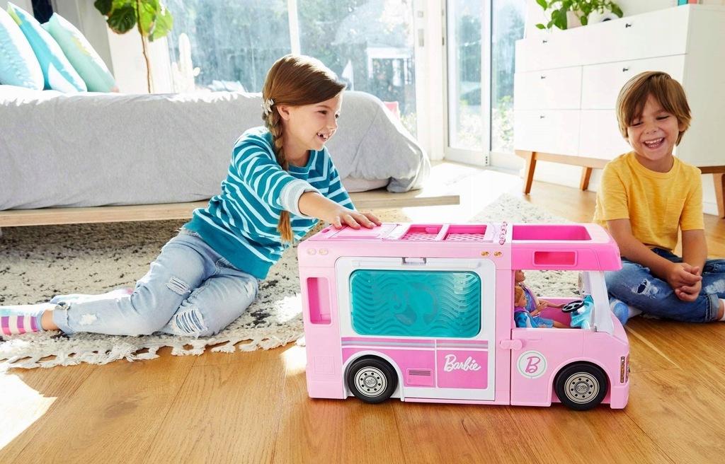Z kamperem Barbie dzieci mogą wyruszyć w świat wyobraźni. Mali odkrywcy powyżej 3 lat pokochają podróże z Kamperem 3 w 1 Dreamcamper Barbie, bo odkryją, że z Barbie mogą być kim chcą!