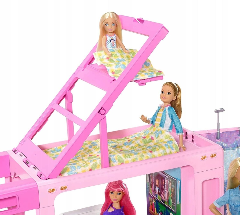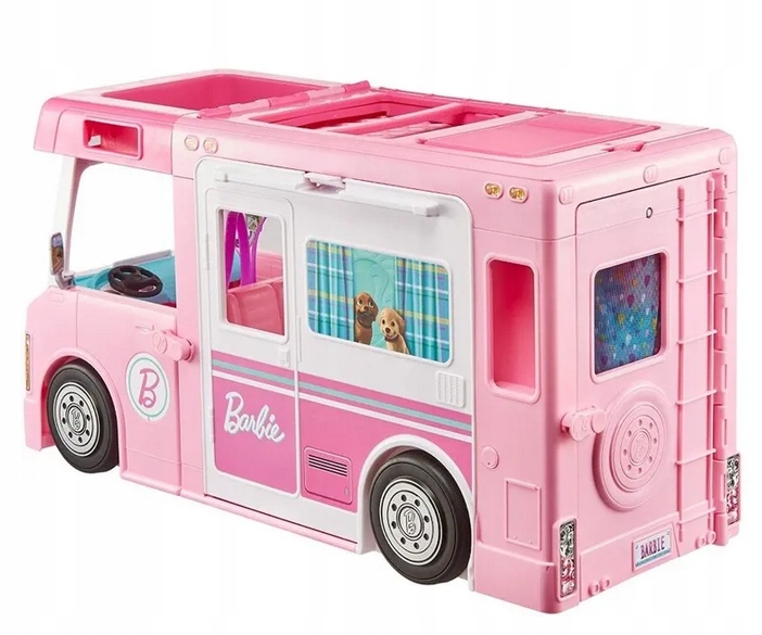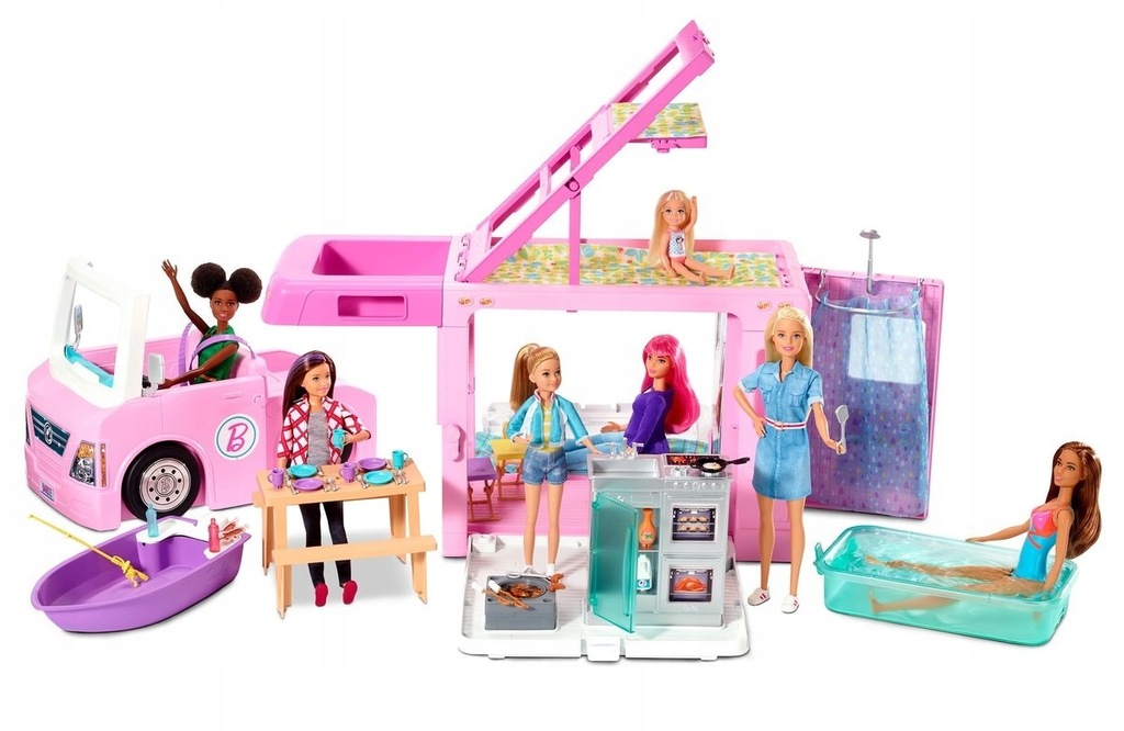 Z tym pojazdem Barbie możliwości zabawy są nieograniczone: kryją się w nim samochód, łódka i zestaw kempingowy z 5 obszarami zabawy.