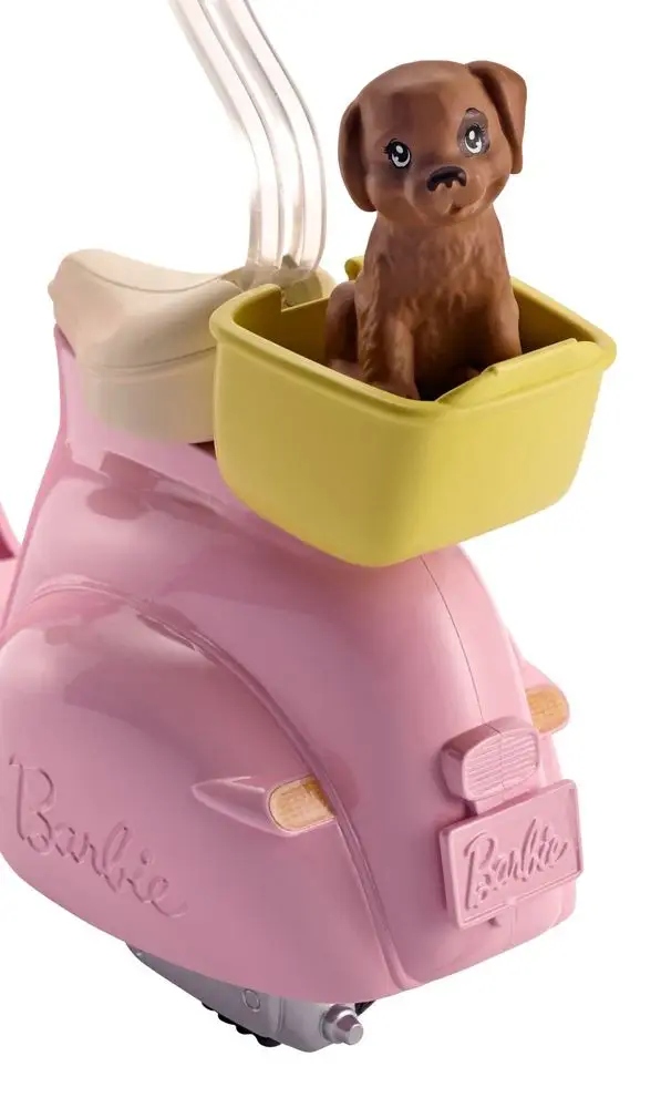 W zestawie skuter dla Barbie z koszykiem, szczeniaczkiem i kaskiem.