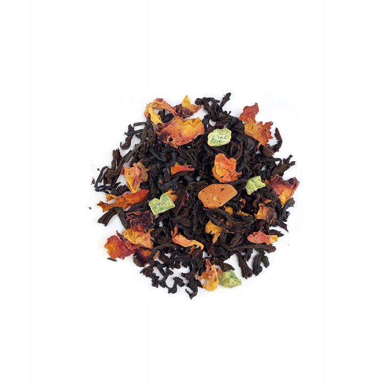 ✔️ Składniki: czarna liściasta herbata cejlońska Orange Pekoe (73,5%), owoce papai (20%), płatki róży (3%) oraz aromat świątecznego churros (3,5%).