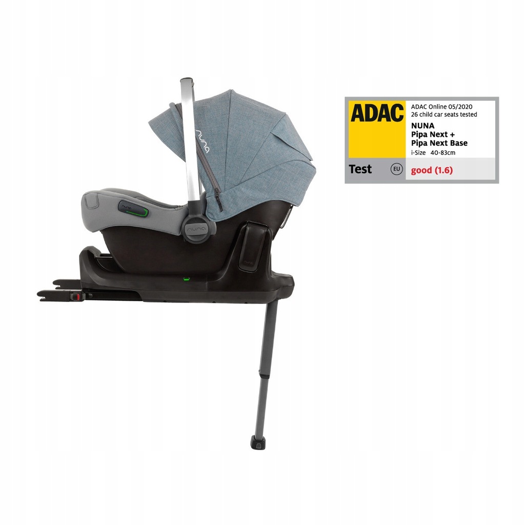W testach Stiftung Warentest i ADAC 2020 fotelik Nuna Pipa Next z bazą trzymał najwyższą ocenę dla fotelika samochodowego i- size do 83/85cm w kategorii bezpieczeństwo otrzymując ocenę 1,2. Fotelik otrzymał łączny wynik „dobry” (1,6) - 4 gwizdki.