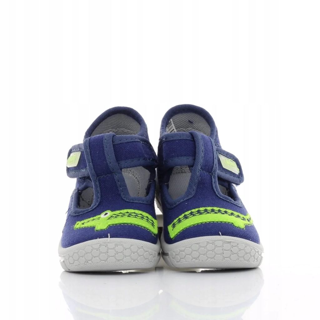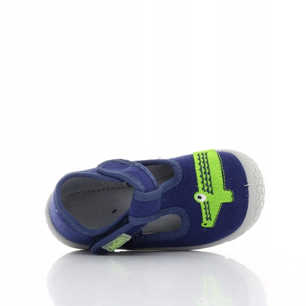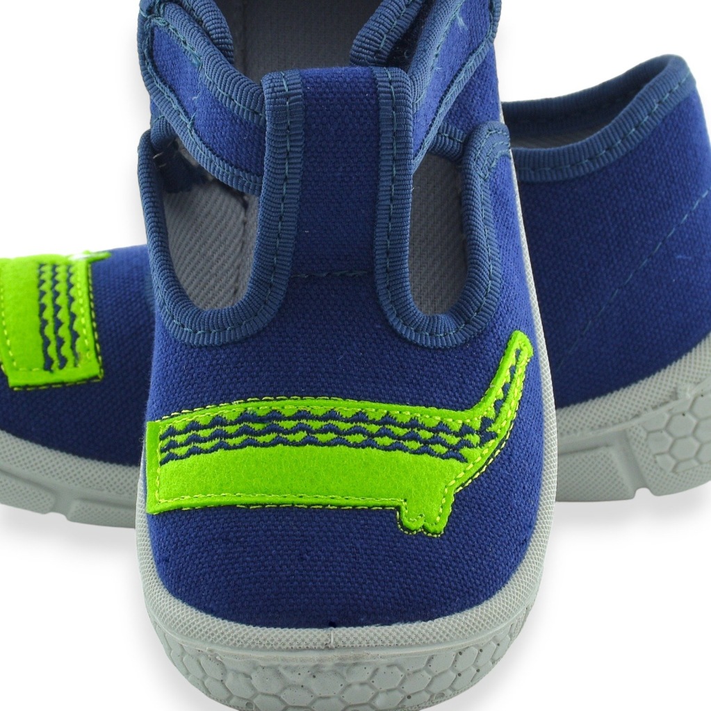 Kapcie dla chłopca do żłobka lub przedszkola. Kapcie zdobi długi zielony krokodyl. Kapcie są lekkie, mają miękką wkładkę, szerokie przody a to wszystko razem daje komfort małym stópkom. Łatwe zapięcie na rzep.