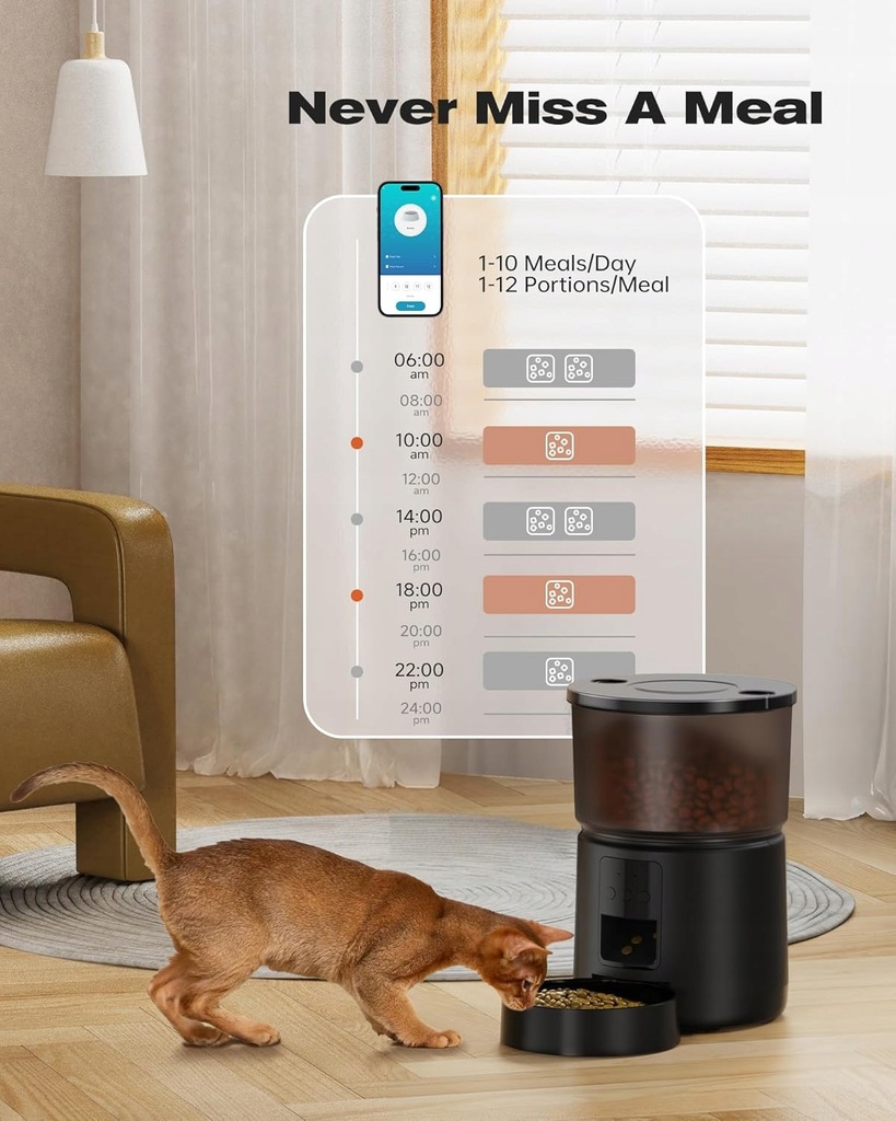Urządzenie o pojemności 3 litrów pozwala zaplanować do 10 posiłków dziennie, a funkcja nagrywania głosu sprawia, że kot poczuje Twoją obecność nawet podczas Twojej nieobecności.