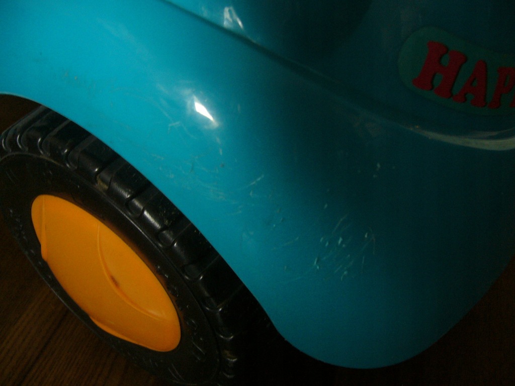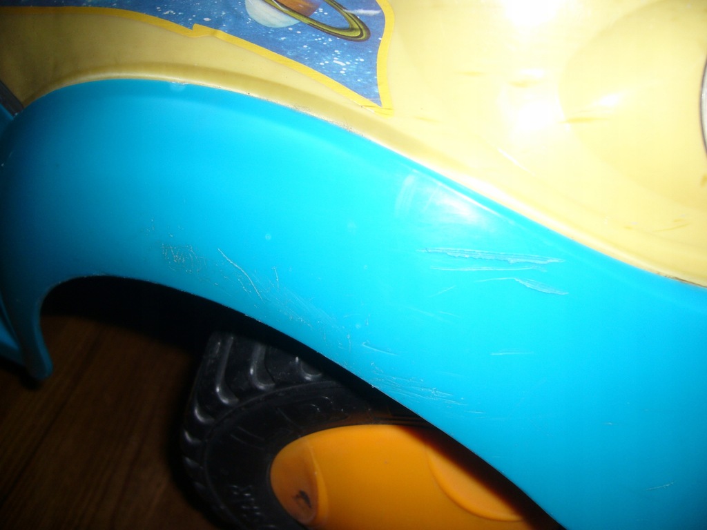 Zabawka użytkowana wyłącznie w domu, bez wychodzenia na dwór więc koła są w bardzo dobrym stanie, niepościerane.