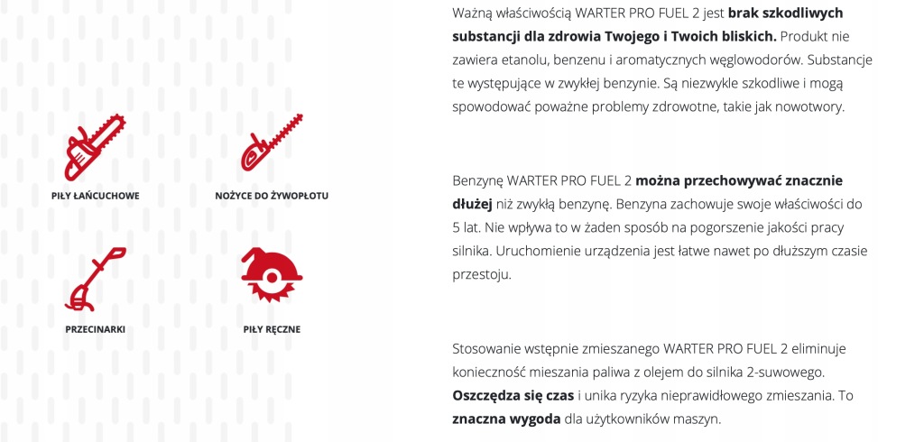 WARTER PRO jest przyjaznym paliwem nie tylko dla Twojego zdrowia i ekologii Twojego otoczenia, ale także do maszyn ogrodniczych. Utrzymuje silnik w czystości i ułatwia uruchamianie. Można je pozostawić w zbiorniku urządzeń/maszyn w zimie, a następnie użyć z tym samym paliwem dopiero na wiosnę.
