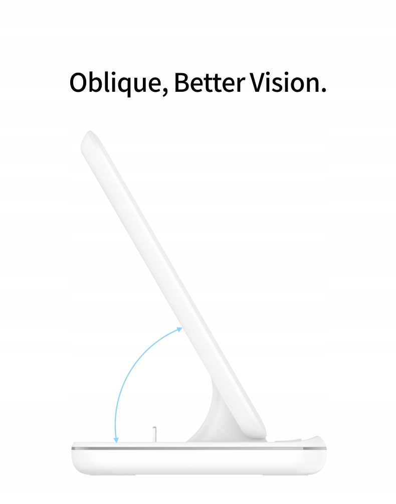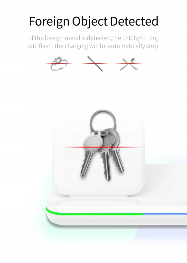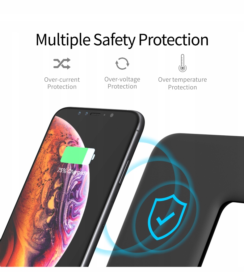 【Bezpieczna stacja ładująca】. Kwalifikowana z certyfikatem Qi, wyposażona również w zabezpieczenie nadprądowe, zabezpieczenie przed przepięciem, zabezpieczenie przed przeciążeniem, zabezpieczenie przed przegrzaniem i zabezpieczenie przed zwarciem, bezprzewodowa stacja ładująca zapewnia bezpieczne, niezawodne i szybkie ładowanie. Gumowe nóżki pod podstawą zapewniają, że stacja ładująca pozostanie na stole / stoliku nocnym bez ruchu.