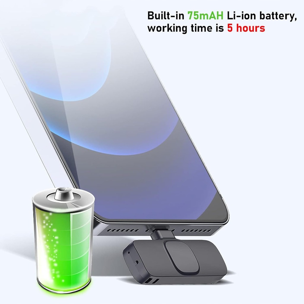 Mikrofon Lavalier pracuje bezprzewodowo, a dzięki plug & play szybko połączysz go z kompatybilnym urządzeniem. Pasmo 2.4 GHz zapewnia stabilny sygnał do 10 m na zewnątrz, a w pomieszczeniach – do 20 m. Akumulator litowy o pojemności 70 mAh oferuje do 5 h pracy, a dołączony do zestawu kabel ułatwia ładowanie.