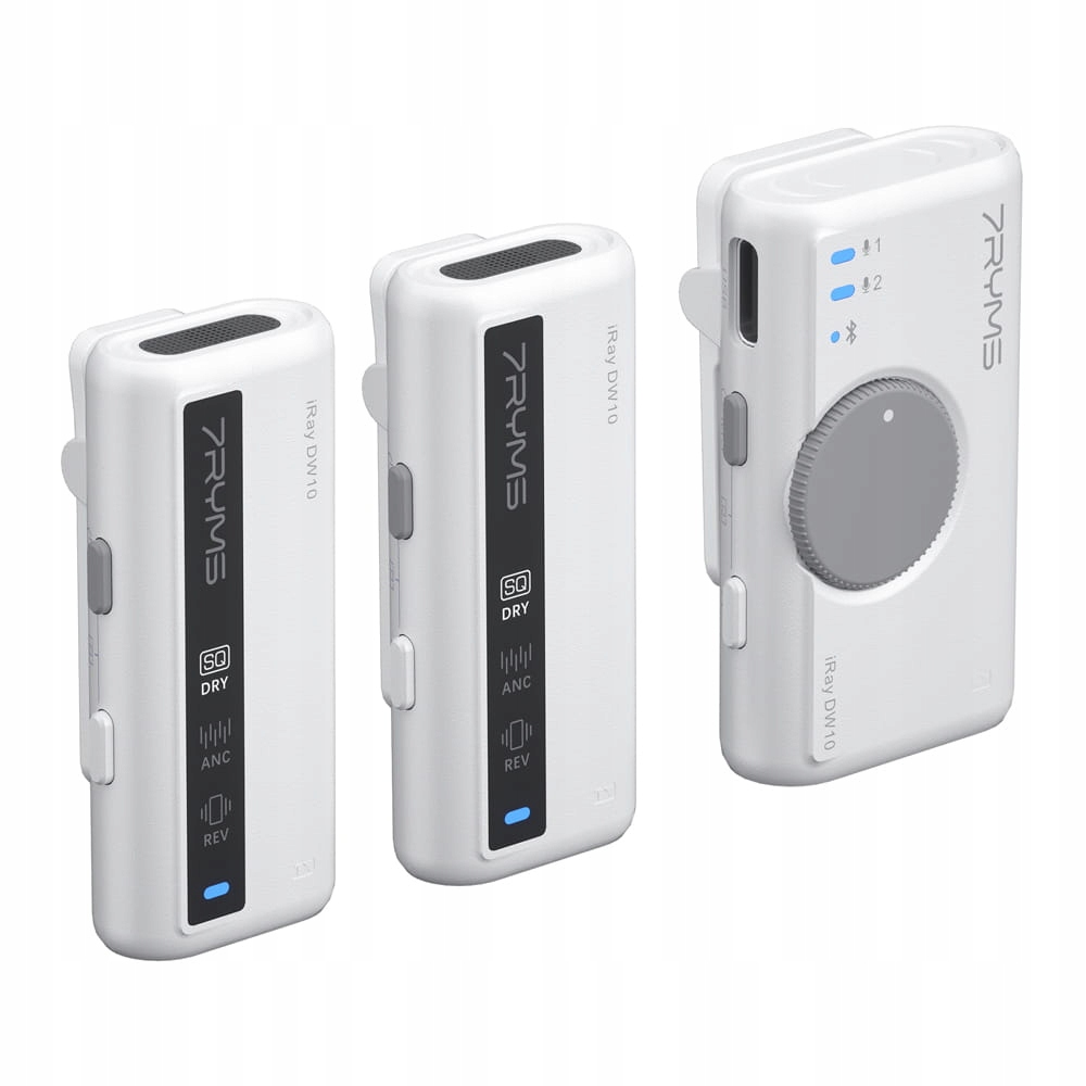iRay DW10 to bezprzewodowy zestaw mikrofonów marki 7Ryms. W jego skład wchodzą dwa nadajniki oraz odbiornik. Może współpracować z aparatami fotograficznymi oraz kamerami ze złączem mini jack 3,5 mm oraz ze smartfonami i komputerami z gniazdem USB-C. Mikrofony oferują funkcję redukcji szumów oraz dodania efektu pogłosu. Dzięki wbudowanemu modułowi Bluetooth do naszych nagrań możemy również dodać dowolne dźwięki tła. Kolor biały.