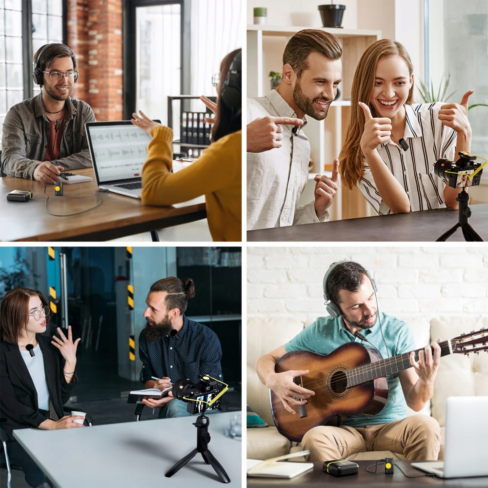 Dwukanałowy odbiornik może pracować z jednym lub dwoma nadajnikami realizując połączenie mono lub stereo. Wbudowana karta dźwiękowa pozwala na płynną regulację czułości i oferuje trzy tryby nagrywania: standardowy (dźwięk oryginalny), tryb wykorzystujący aktywną redukcję szumów, a także tryb pogłosu. Dzięki modułowi Bluetooth odbiornik umożliwia też bezprzewodowe podłączenie zewnętrznego audio – możemy w ten sposób wzbogacić nasze nagranie o dowolny dźwięk tła czy podkład muzyczny, np. z YouTube czy Spotify. Port mini jack 3,5 mm w odbiorniku - jeśli nie jest wykorzystywany do podłączenia urządzenia rejestrującego - może też pełnić funkcję gniazda słuchawkowego do monitorowania dźwięku. Odsłuch bezpośrednio z nadajników jest możliwy przez porty USB-C.