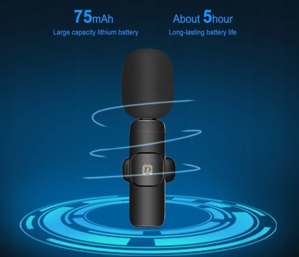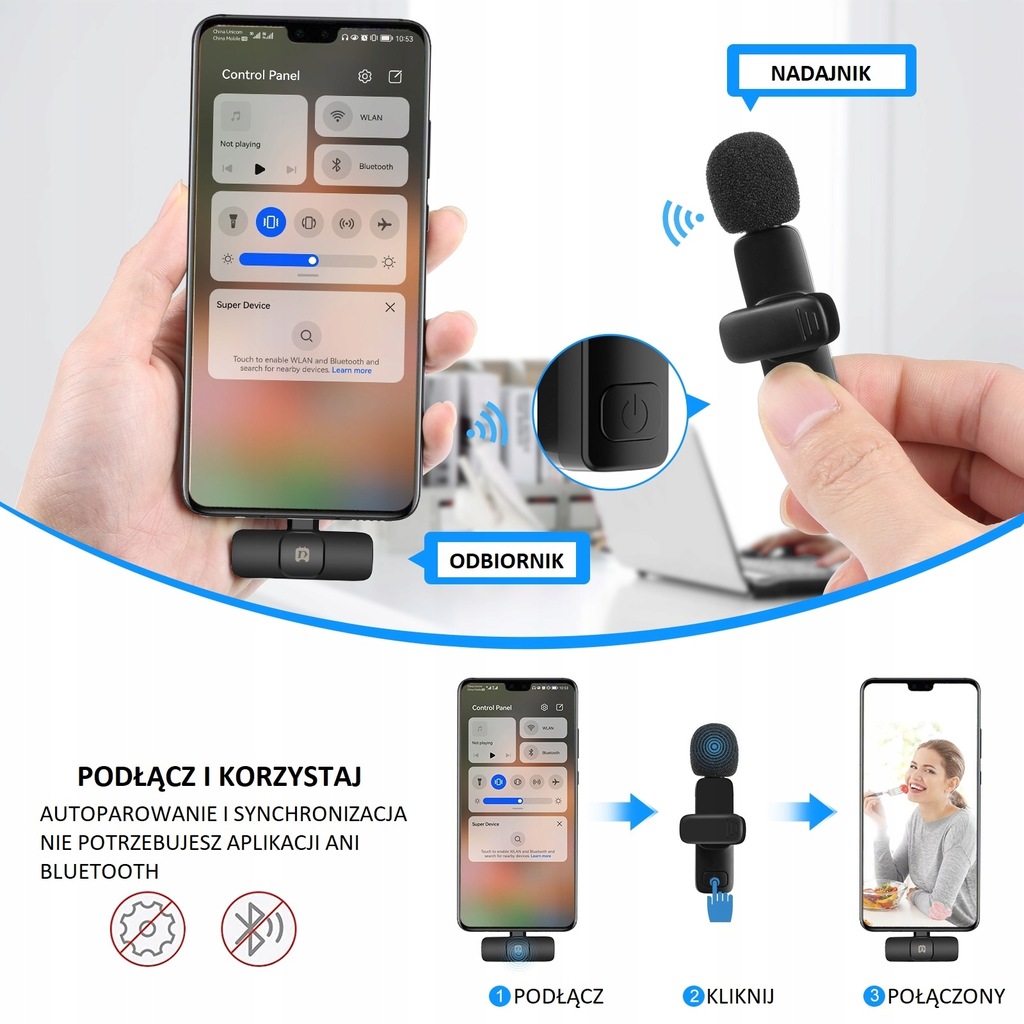 Używanie mikrofonu nie wymaga żadnej aplikacji ani bluetooth - system Plug and Play. Mikrofon posiada akumulator.