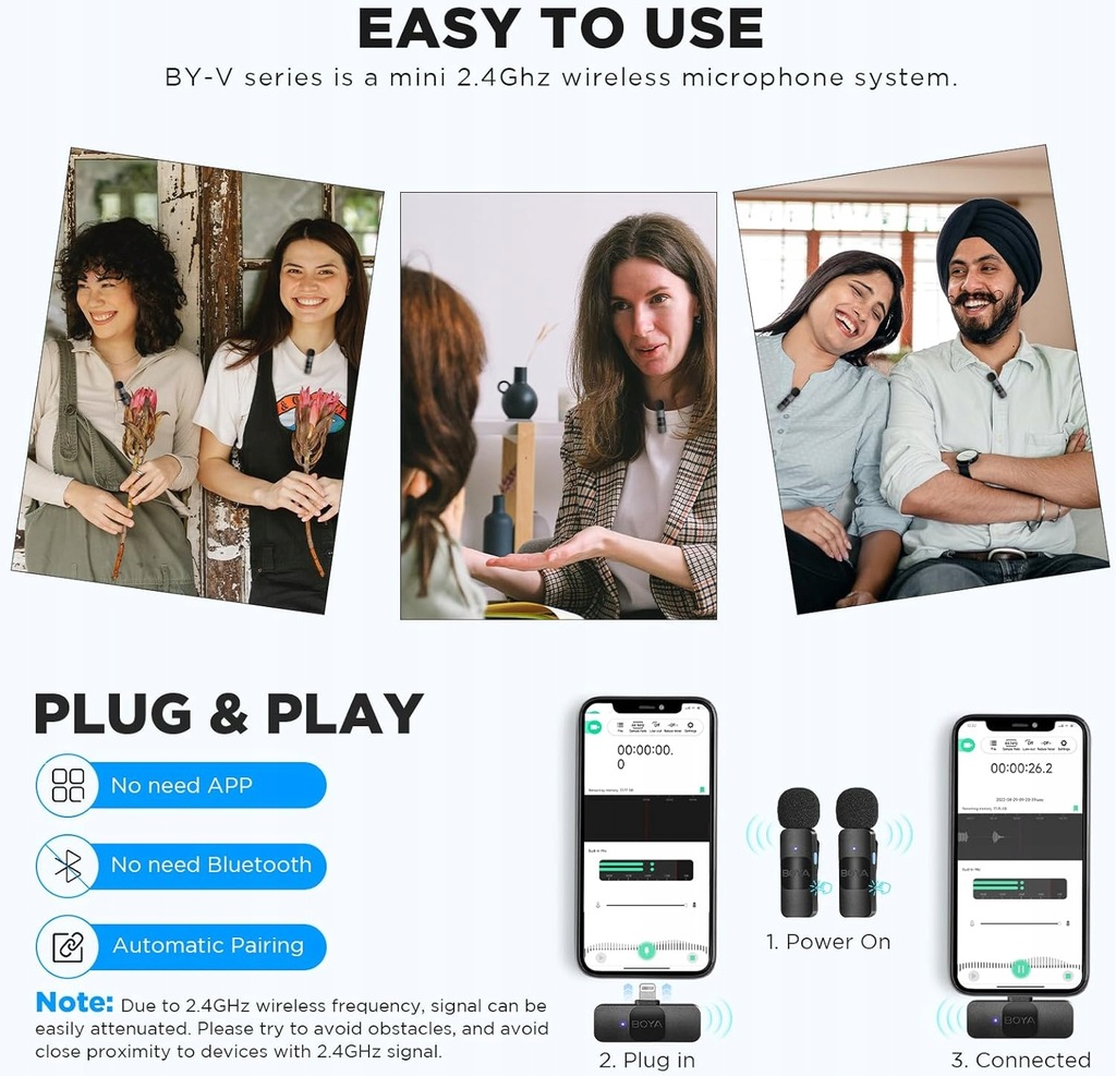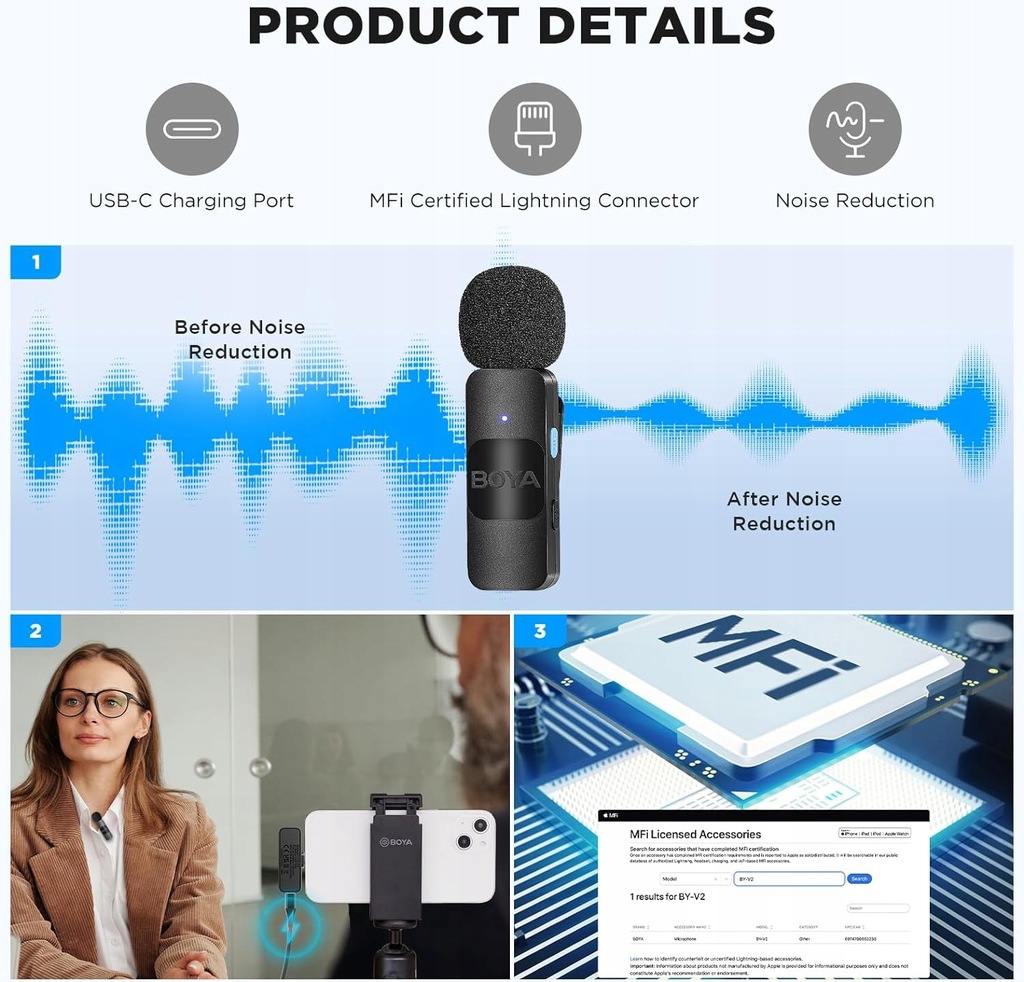 Czy jesteś gotowy, aby przenieść swoje mobilne nagrania na kolejny poziom? Przedstawiamy profesjonalny system bezprzewodowych mikrofonów BY-V2! Niezależnie od tego, czy jesteś globtroterem, zapalonym podcasterem, czy pasjonatem transmisji na żywo, ten dwukanałowy mikrofon bezprzewodowy jest stworzony specjalnie dla urządzeń Apple iOS, zapewniając Ci maksymalną swobodę nagrywania.