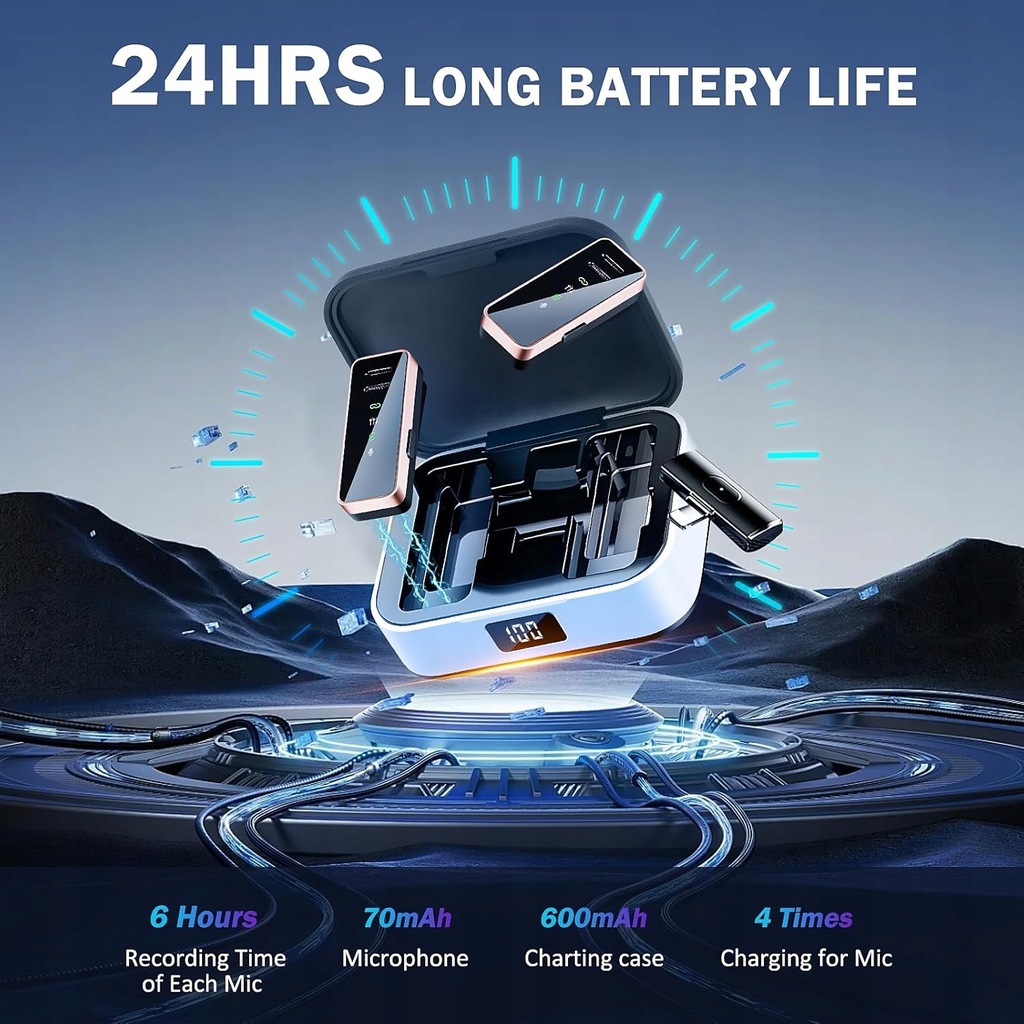 ✔️ DŁUGI CZAS PRACY BATERII: Mikrofon jest dostarczany z ładowarką wyposażoną w wyświetlacz cyfrowy, pokazującym poziom baterii. Po pełnym naładowaniu mikrofon może działać do 6 godzin, a ładowarka pozwala na 4 dodatkowe cykle, co łącznie daje aż 24 godziny użytkowania.