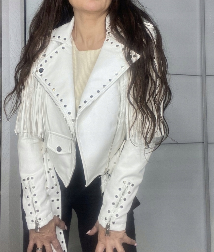 Biała ramoneska z eko skóry z ozdobnymi frędzlami na przodzie i na rękawach. Ćwieki z przodu i z tyłu. Zapinana na zamek. Posiada dwie kieszenie z przodu zapinane na zamek. W talii pasek ze srebrną klamrą. Na zakończeniach rękawów zamki, dzięki czemu można je poszerzyć.