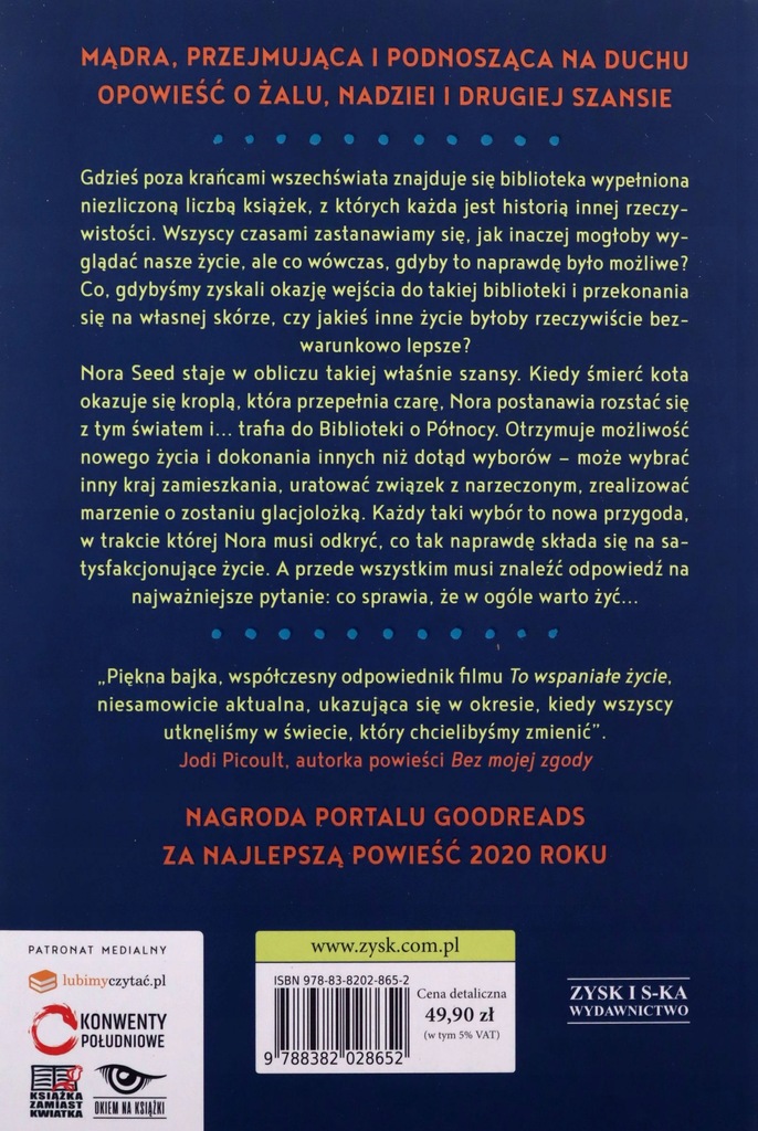 Mądra, przejmująca i podnosząca na duchu opowieść o żalu, nadziei i drugiej szansie Gdzieś poza krańcami wszechświata znajduje się biblioteka wypełniona niezliczoną liczbą książek, z których każda jest historią innej rzeczywistości. Wszyscy czasami zastanawiamy się, jak inaczej mogłoby wyglądać nasze życie, ale co wówczas, gdyby to naprawdę było możliwe? Co, gdybyśmy zyskali okazję wejścia do takiej biblioteki i przekonania się na własnej skórze, czy jakieś inne życie byłoby rzeczywiście bezwarunkowo lepsze? Nora Seed staje w obliczu takiej właśnie szansy. Kiedy śmierć kota okazuje się ostatnią kroplą, która przepełnia czarę, postanawia rozstać się z tym światem i... trafia do Biblioteki o Północy. Każdy taki wybór to nowa przygoda, w trakcie której Nora musi odkryć, co tak naprawdę składa się na satysfakcjonujące życie. A przede wszystkim musi znaleźć odpowiedź na najważniejsze pytanie: co sprawia, że w ogóle warto żyć? "Pasjonująca, krzepiąca lektura... Wizja nieograniczonych możliwości, nowych dróg, nowego życia, które jest dla nas gdzieś dostępne. Biblioteka o Północy pokazuje nam w tych trudnych, niespokojnych czasach, że możemy żyć inaczej, tak, jak chcemy". "The New York Times" "Piękna bajka, współczesny odpowiednik filmu To wspaniałe życie, niesamowicie aktualna, ukazująca się w okresie, kiedy wszyscy utknęliśmy w świecie, który chcielibyśmy zmienić". Jodi Picoult, autorka powieści Bez mojej zgody NAGRODA PORTALU GOODREADS ZA NAJLEPSZĄ POWIEŚĆ 2020 ROKU