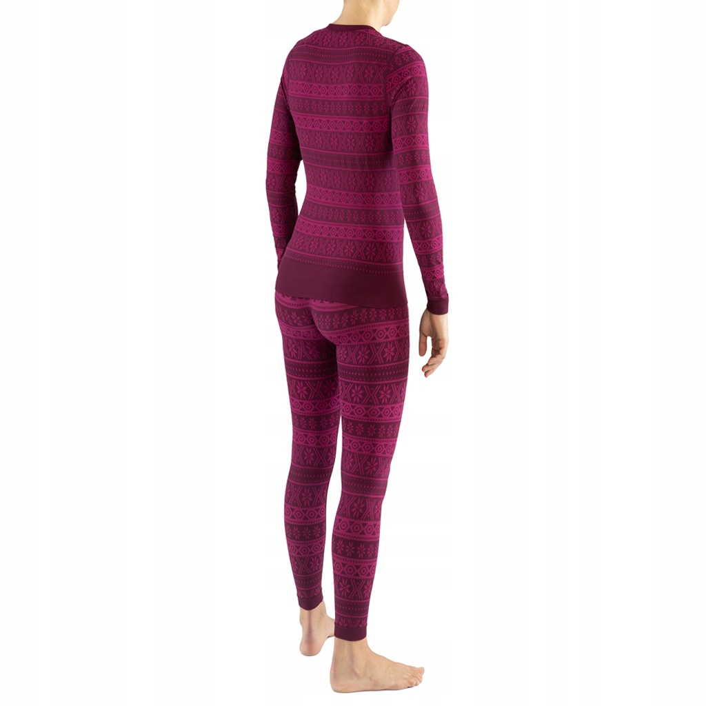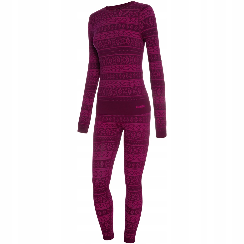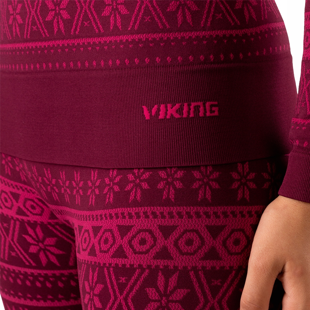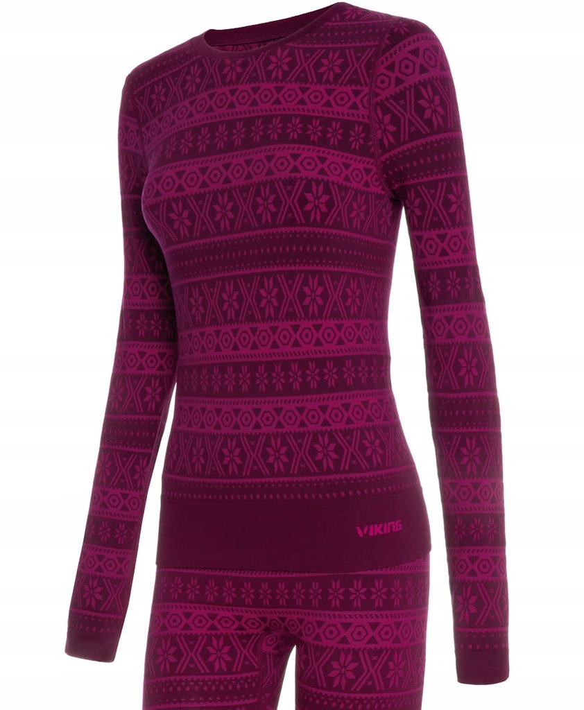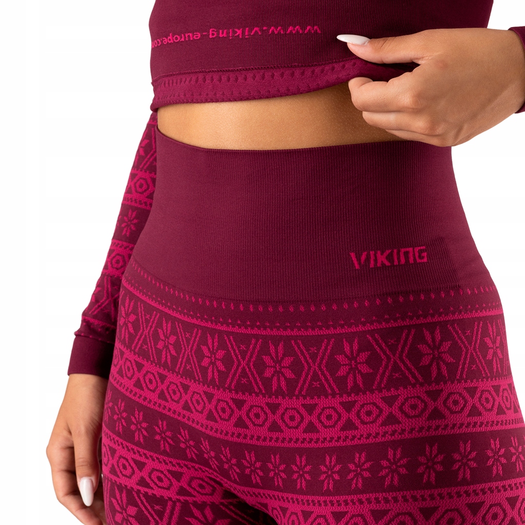 Viking Hera to komplet bielizny termoaktywnej dla kobiet z charakterystycznymi zimowymi zdobieniami. Bardzo ładny i elegancki wzór doskonale wpisuje się w zimową atmosferę. Bielizna ta charakteryzuje się wysoką oddychalnością oraz doskonałymi właściwościami termicznymi. Jest ciepła, bardzo delikatna i miękka w dotyku, dzięki czemu nie podrażnia skóry i jest przyjemna w noszeniu. Dzięki swojej elastyczności doskonale dopasowuje się do ciała. Wysoko umieszczony pas w spodniach dodatkowo poprawi właściwości izolacyjne. Viking Hera to trafiony wybór na długie zimowe wieczory.