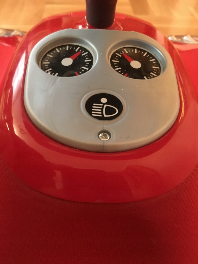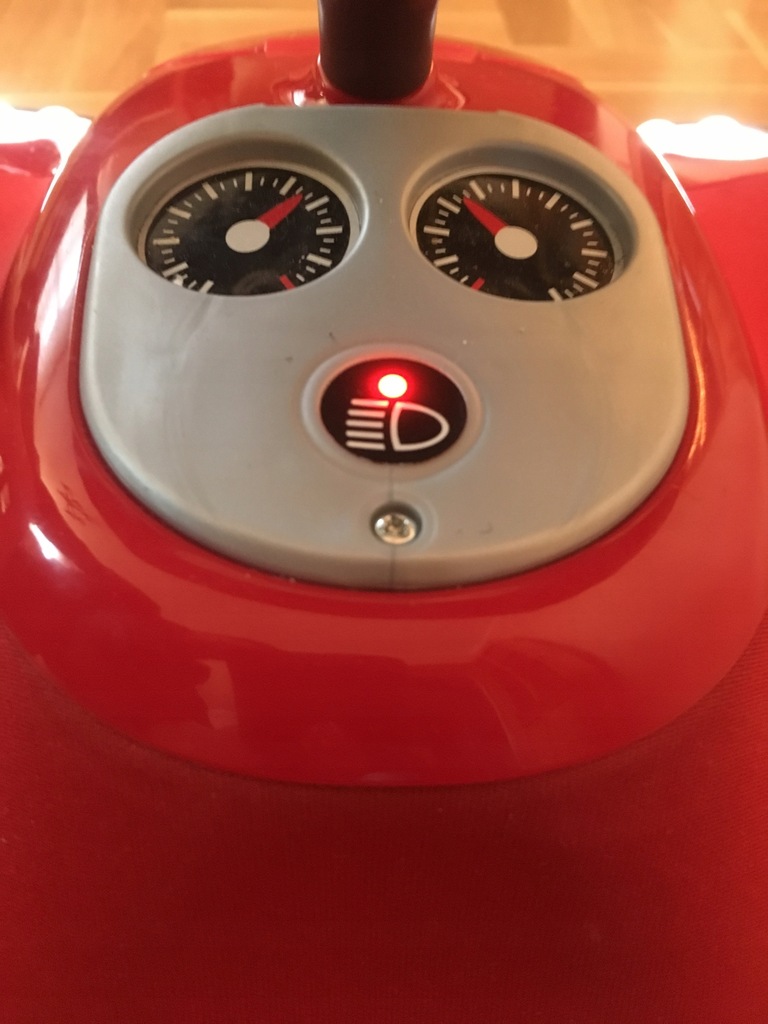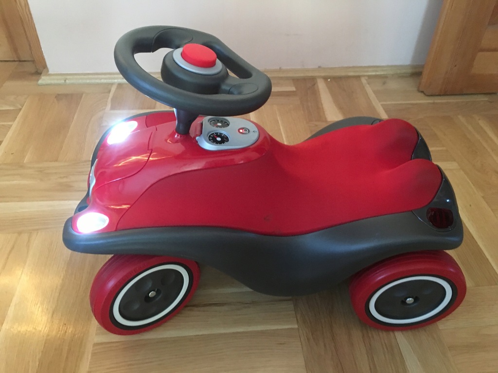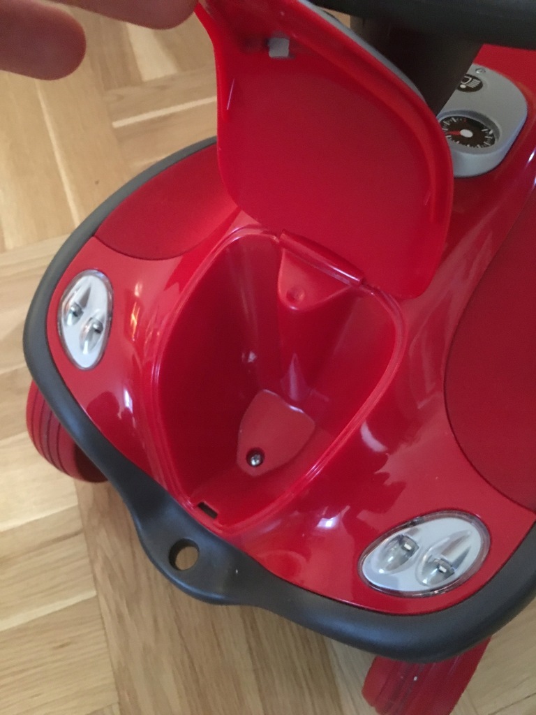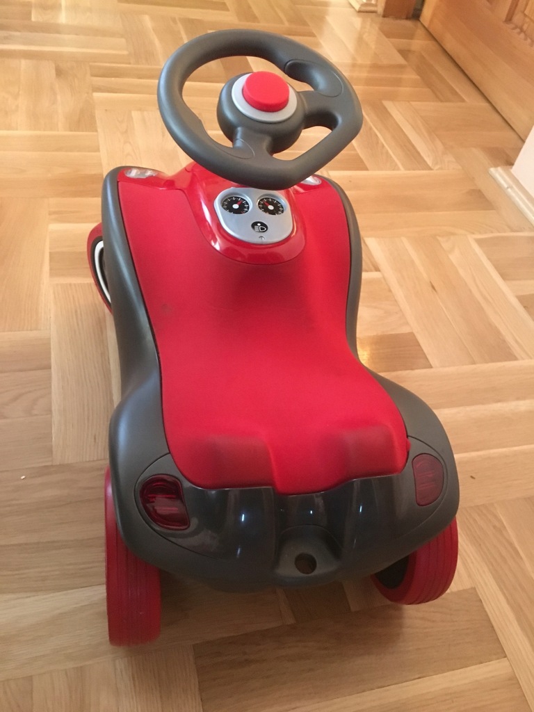 Jeździk jest używany. Widać na nim drobne użytkowe przybrudzenie fotela.