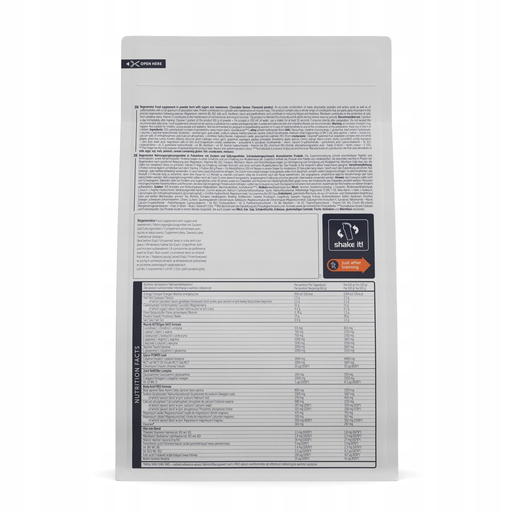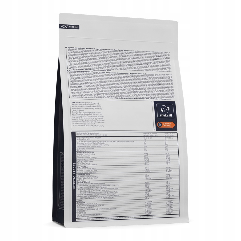 REGENERATOR® jest przemyślaną kompozycją składników szczególnie istotnych w okresie regeneracji powysiłkowej. To precyzyjne zestawienie szybko wchłanianych peptydów, aminokwasów oraz węglowodanów o pełnym spektrum szybkości wchłaniania. Produkt zawiera w porcji 21g białka, które przyczynia się do wzrostu masy mięśniowej i pomaga w jej utrzymaniu. W składzie znalazły się też m.in.: magnez, witaminy B2, B6, B12 oraz kwas foliowym, niacyna i kwas pantotenowy, które przyczyniają się do zmniejszenia uczucia zmęczenia i znużenia. Magnez ponadto pomaga m.in. w prawidłowym funkcjonowaniu mięśni. Witamina B2 (ryboflawina) pomaga chronić komórki przed stresem oksydacyjnym. Witamina B6 przyczynia się do utrzymania prawidłowego metabolizmu białka i glikogenu, a witamina B12 i kwas pantotenowy mają wpływ na utrzymanie prawidłowego metabolizmu energetycznego. Jest też witamina D wspomagająca kości i mięśnie.