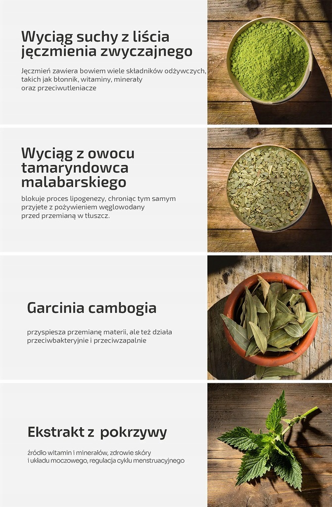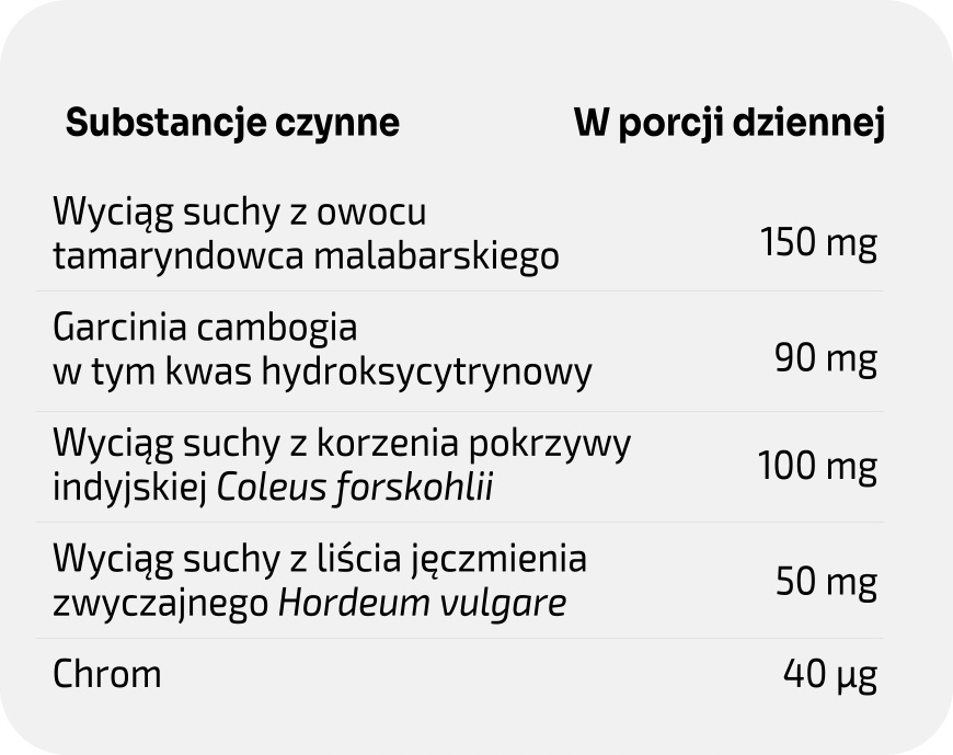 Suplement diety zawiera w swoim składzie wyciąg suchy z owocu tamaryndowca malabarskiego, korzenia pokrzywy indyjskiej Coleus forskohlii oraz liścia jęczmienia zwyczajnego Hordeum vulgare. Ponadto można znaleźć w nim chrom, który pomaga w utrzymaniu prawidłowego poziomu glukozy we krwi oraz przyczynia się do utrzymania prawidłowego metabolizmu makroskładników odżywczych.