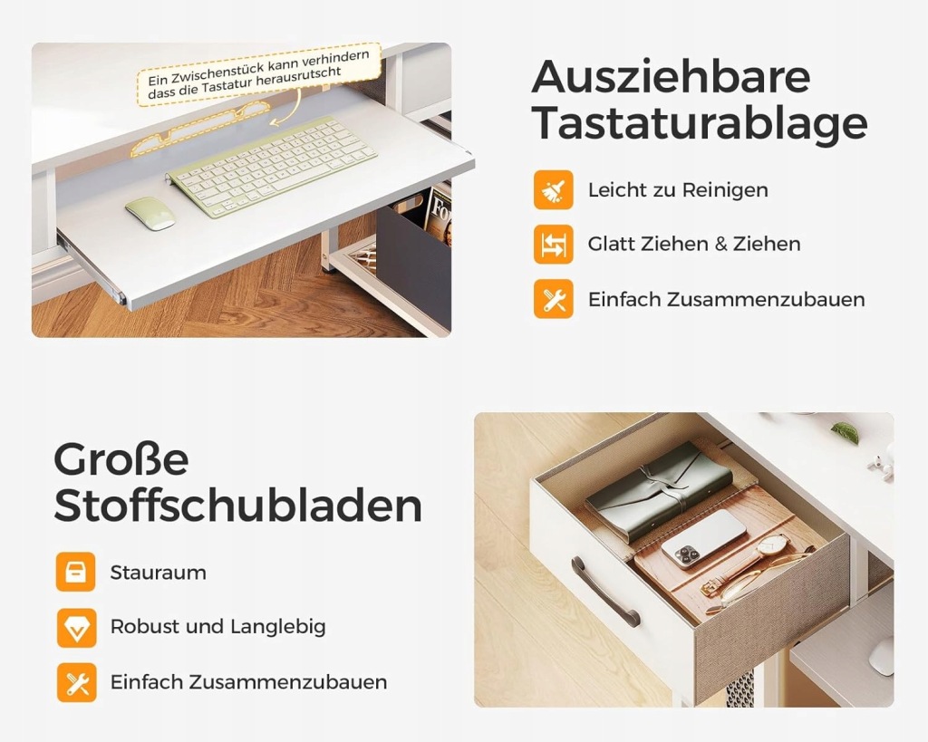 Biurko komputerowe z półką na klawiaturę i szufladami: wysuwana półka na klawiaturę z metalowymi prowadnicami zapewniającymi płynne przesuwanie, odpowiednia dla klawiatury i myszy, zapewniająca lepsze wrażenia podczas grania i pracy. Stół biurowy jest wyposażony w 2 boczne szuflady, które idealnie nadają się do przechowywania książek, materiałów biurowych lub sprzętu do gier, dzięki czemu przestrzeń będzie lepiej zorganizowana.