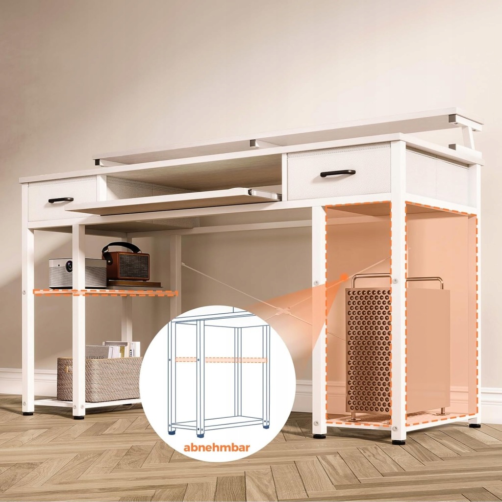 Stół gamingowy ze stojakiem na komputer i półkami: biurko ze schowkiem jest wyposażone w stojak na komputer i otwarte półki, które zapewniają mnóstwo miejsca do przechowywania. Środkowy regał jest zdejmowany, może to być 2-poziomowy regał na książki lub stojak na komputer. W zależności od preferencji regał można zamocować po lewej lub prawej stronie. Otwarty regał zapewnia miejsce na pudełka do przechowywania, książki, instrumenty muzyczne i inne przedmioty.