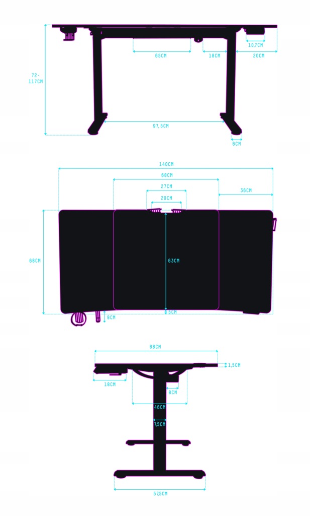 Regulacja wysokości pozwala używać biurko zarówno w pozycji siedzącej, jak i stojącej, w zakresie od 72 do 117 cm. To sprawia, że to biurko komputerowe jest idealne dla każdego użytkownika- każdy znajdzie coś dla siebie!